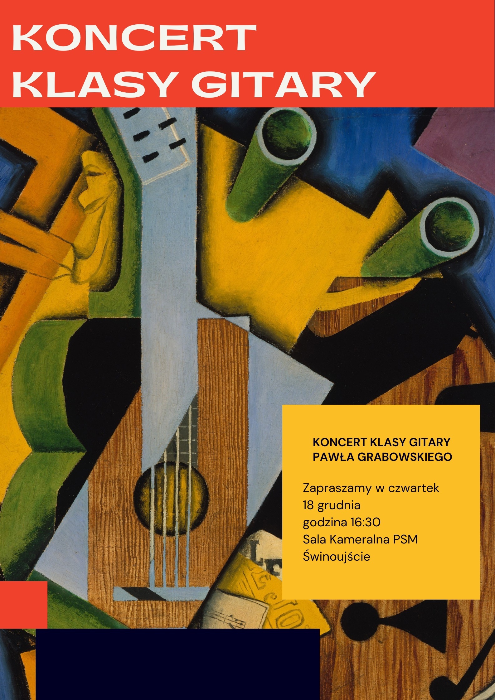 Serdecznie zapraszamy na Koncert klasy gitary, podczas którego uczniowie zaprezentują efekty swojej pracy, rozwijane pod okiem nauczyciela pana Pawła Grabowskiego. W programie znajdą się utwory solowe i zespołowe o zróżnicowanym charakterze, repertuar przygotowany przez uczniów specjalnie na tę okazję.