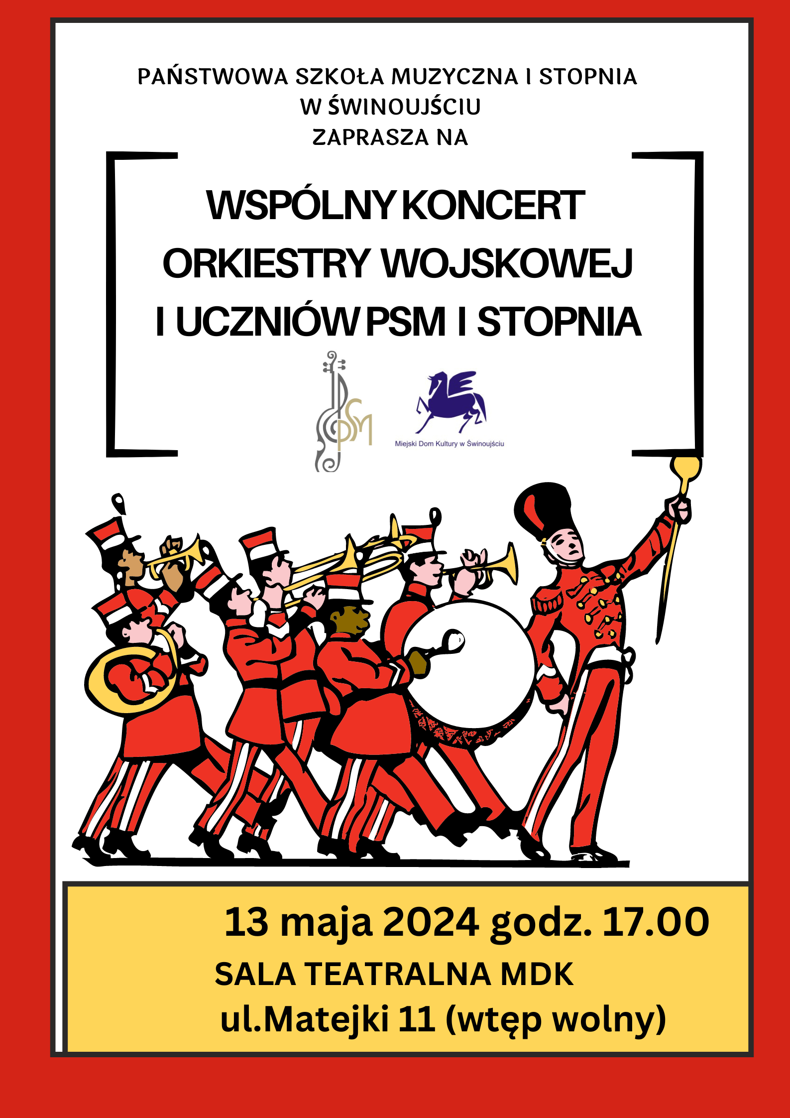 Serdecznie zapraszamy wszystkich zainteresowanych na Koncert Orkiestry Wojskowej i uczniów PSM I stopnia w Świnoujściu. W dniu 13 maja 2024 roku o godzinie 17.00 wystąpią uczniowie wspólnie z Orkiestrą Wojskową grając utwory z gatunku repertuaru rozrywkowego i wojskowego. Życzymy miłego odbioru.