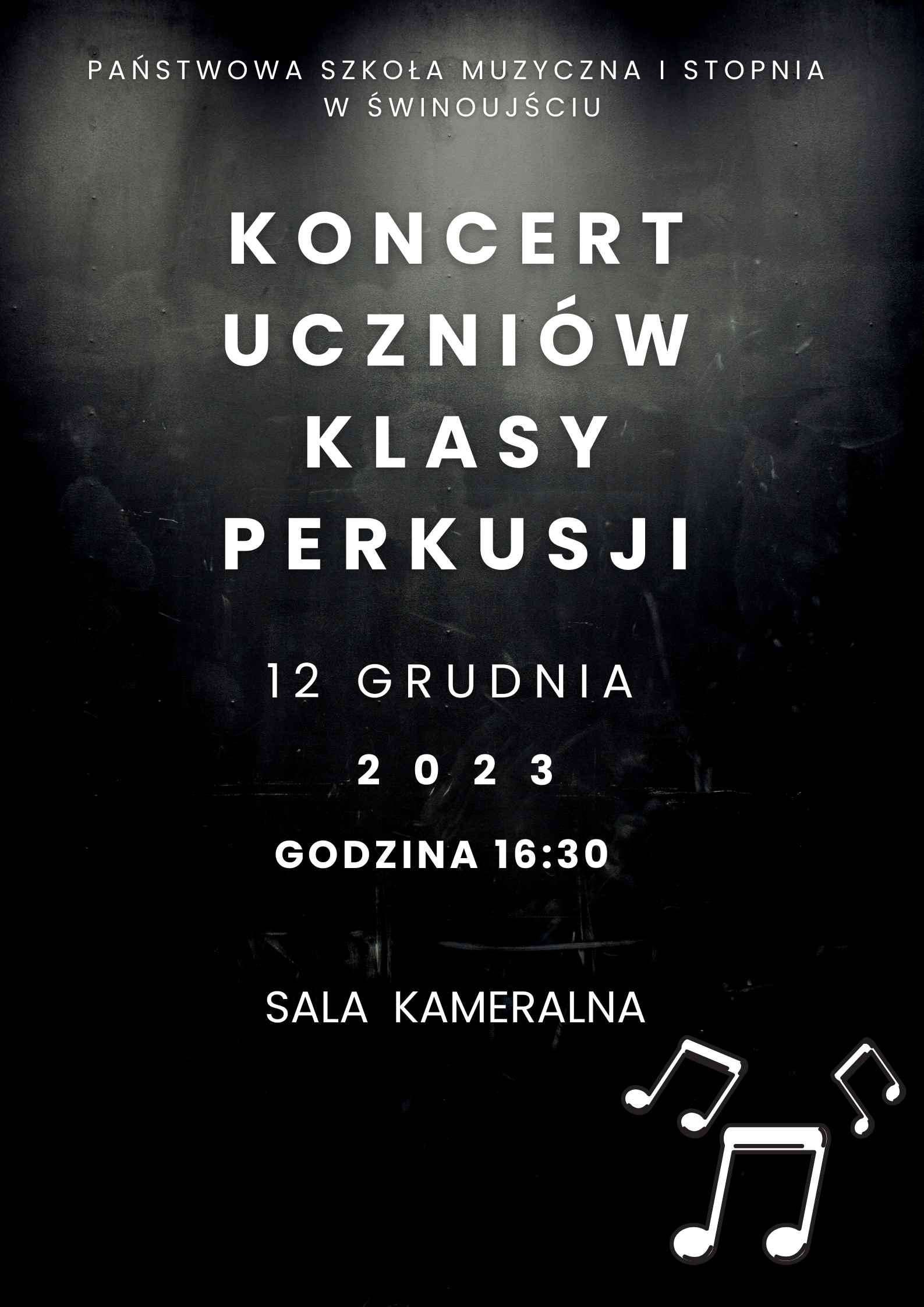 W dniu 12 grudnia 2023 r. o godzinie 16:30 w sali kameralnej szkoły odbędzie się Koncert perkusyjny. Uczniowie z klasy perkusji przedstawią różne gatunki muzyki: klasyczną, rozrywkową oraz filmową. Wykonanie solowe z towarzyszeniem akompaniamentu, duety a także zespół perkusyjny.