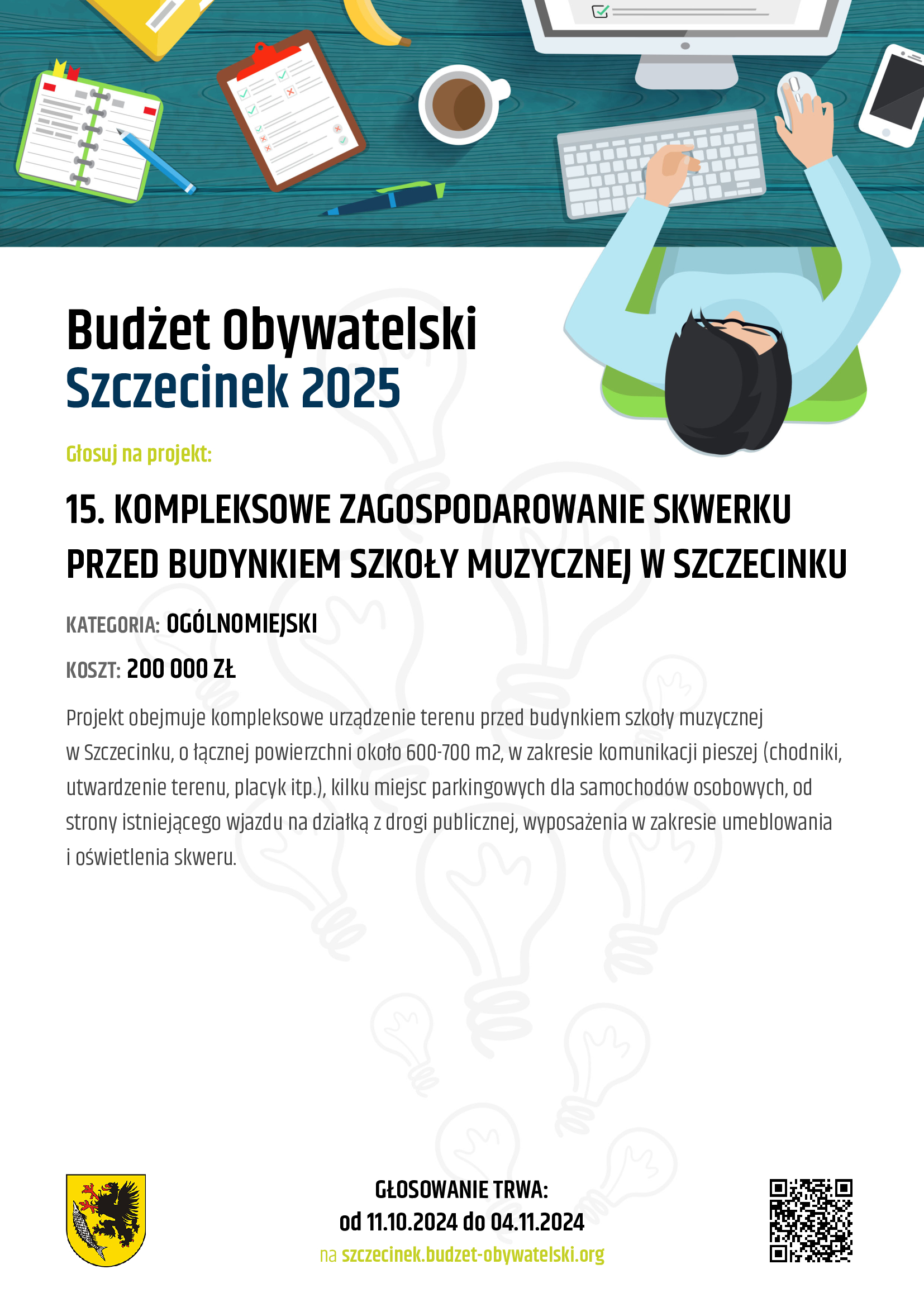 PROJEKT NR 15 to KOMPLEKSOWE ZAGOSPODAROWANIE SKWERKU PRZED BUDYNKIEM SZKOŁY MUZYCZNEJ W SZCZECINKU.