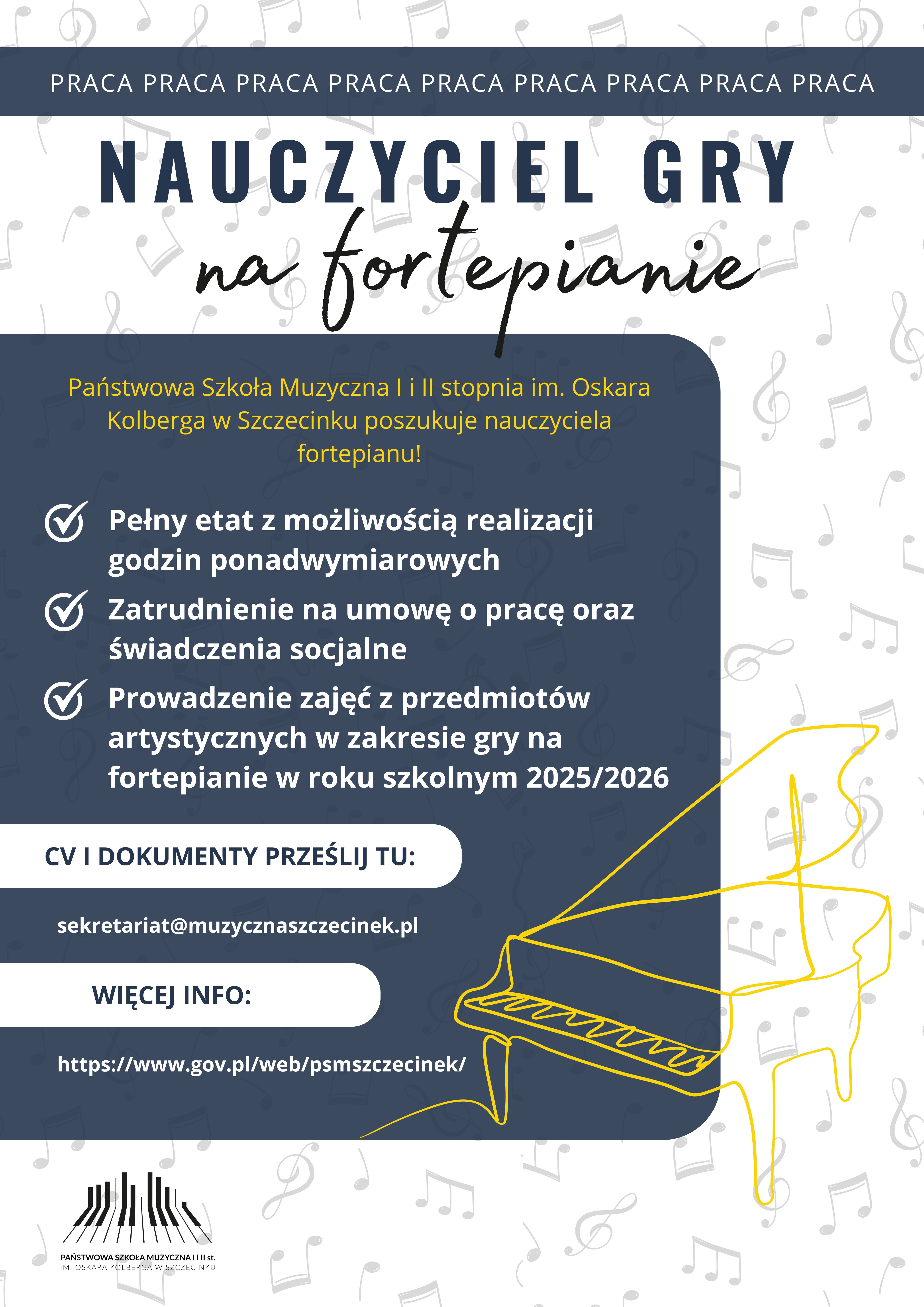 Zatrudnienie na pełny etat z możliwością realizacji godzin ponadwymiarowych w Państwowej Szkole Muzycznej I i II stopnia im. Oskara Kolberga w Szczecinku, prowadzonej przez Ministra Kultury i Dziedzictwa Narodowego. Szkoła realizuje wyłącznie przedmioty artystyczne. Zajęcia odbywają się w dni robocze, w godzinach popołudniowych.