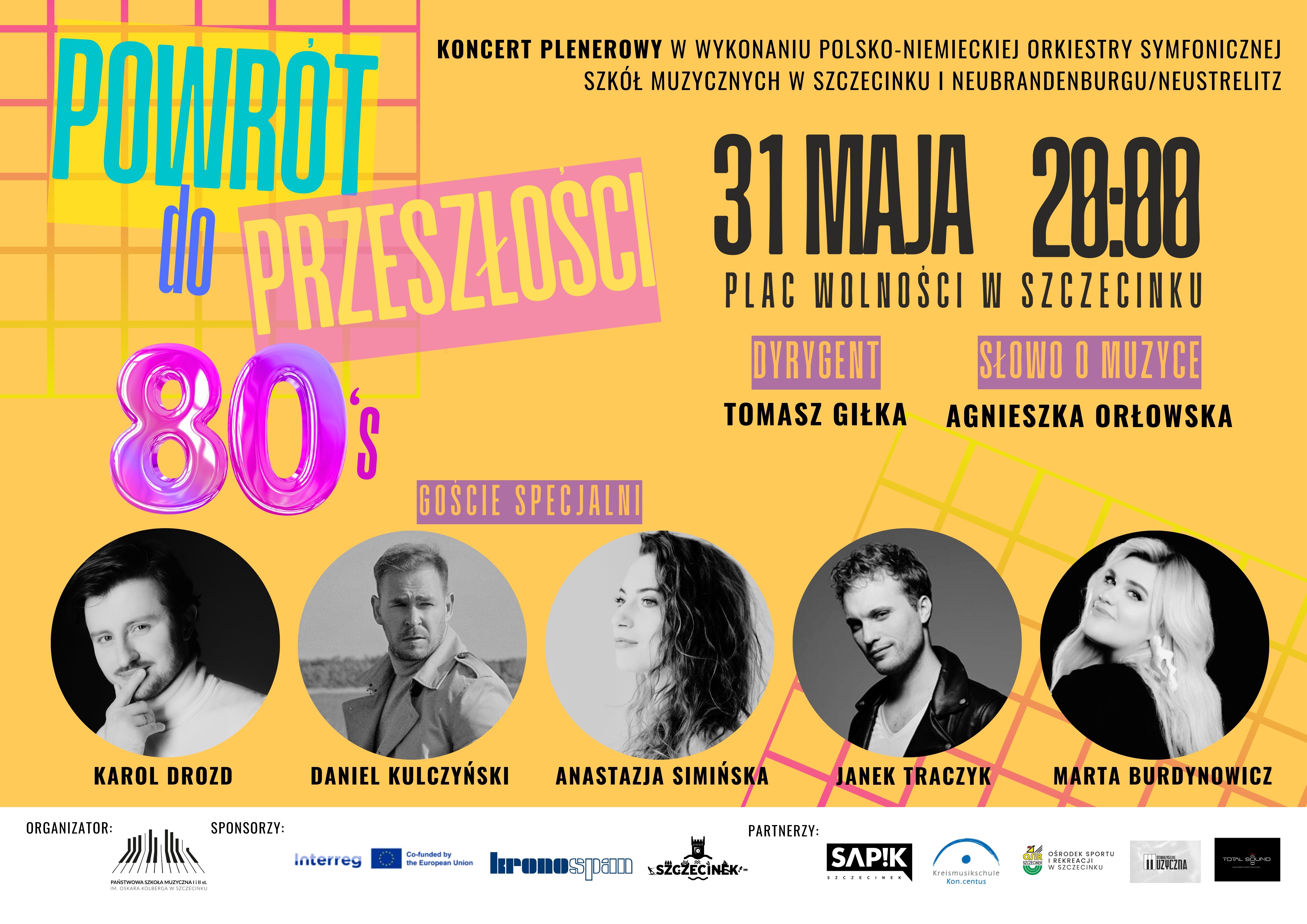 Orkiestra symfoniczna szkół muzycznych w Szczecinku i Neubrandenburgu/Neustrelitz powracają w tanecznym stylu! Już 31 maja na placu Wolności wybrzmią najsłynniejsze przeboje lat 80! Swoją obecnością koncert uświetnią także: Karol Drozd, Daniel Kulczyński, Anastazja Simińska, Janek Traczyk oraz Marta Burdynowicz. Szykuje się głośne, radosne i gorące widowisko!