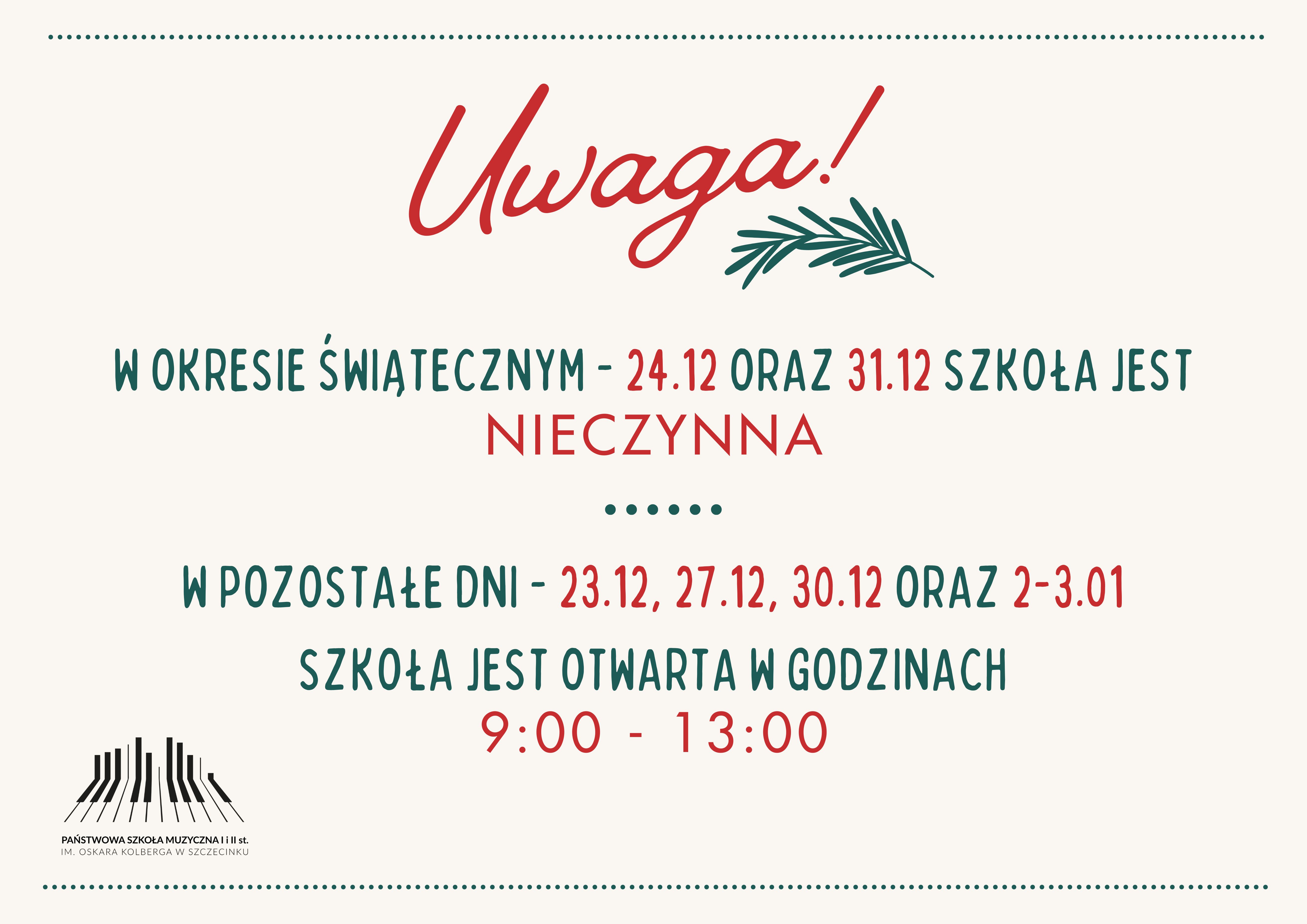 W okresie świątecznym - 24.12 oraz 31.12 szkoła jest nieczynna.
