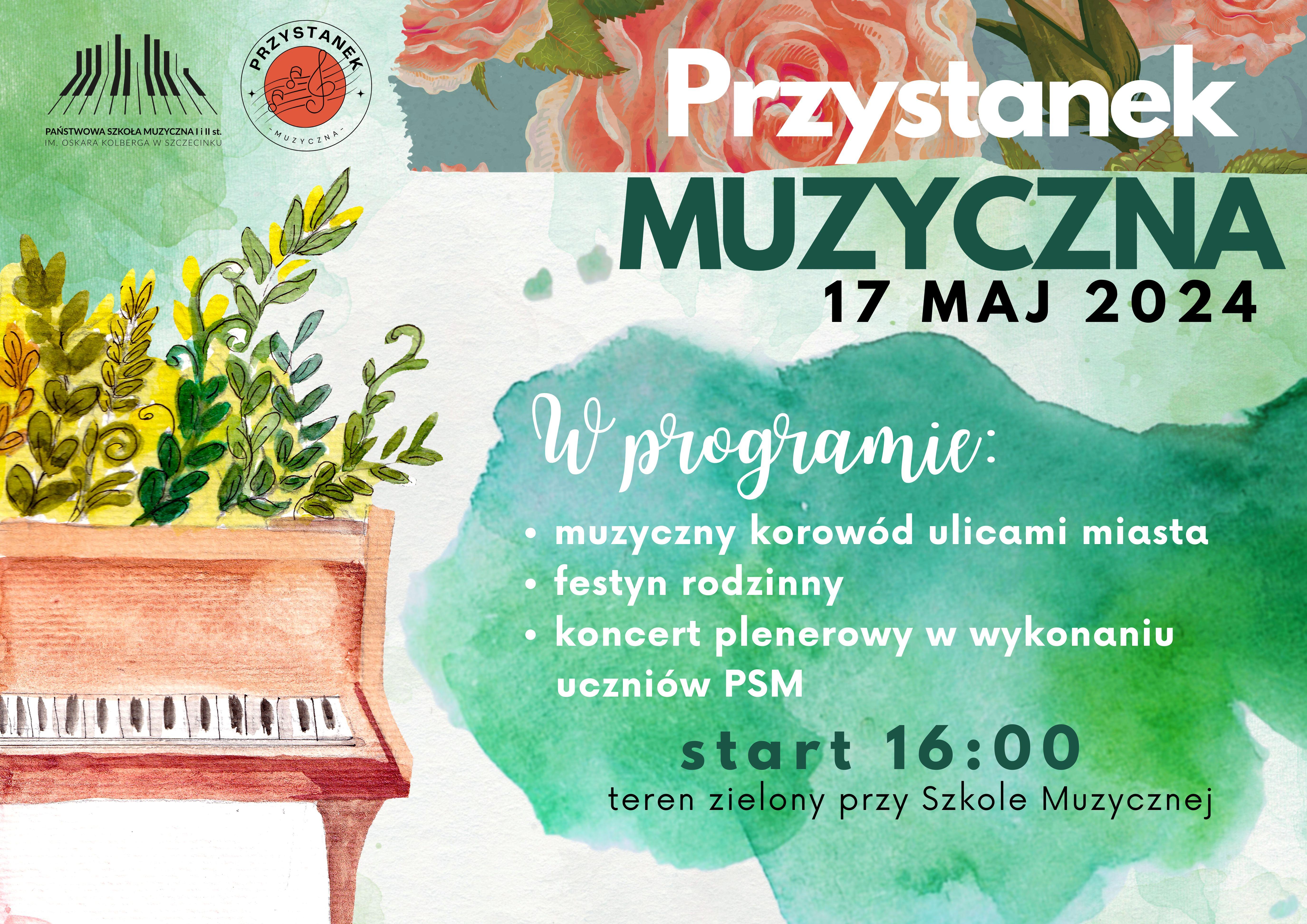 Najdrożsi melomani! Już 17 maja PSM w Szczecinku ponownie zaprasza Was na Przystanek Muzyczna - coroczne święto Szkoły dla wszystkich uczniów, rodziców, miłośników muzyki, a PRZEDE WSZYSTKIM zainteresowanych nauką w Szkole Muzycznej! W programie imprezy znajdują się jak zawsze - muzyczny, głośny i kolorowy pochód ulicami miasta, wspólne gry i zabawy, poczęstunek, a także koncert plenerowy w wykonaniu uczniów i nauczycieli naszej szkoły. To impreza, na której nie może Was zabraknąć. Świętujcie z nami czas muzyk.