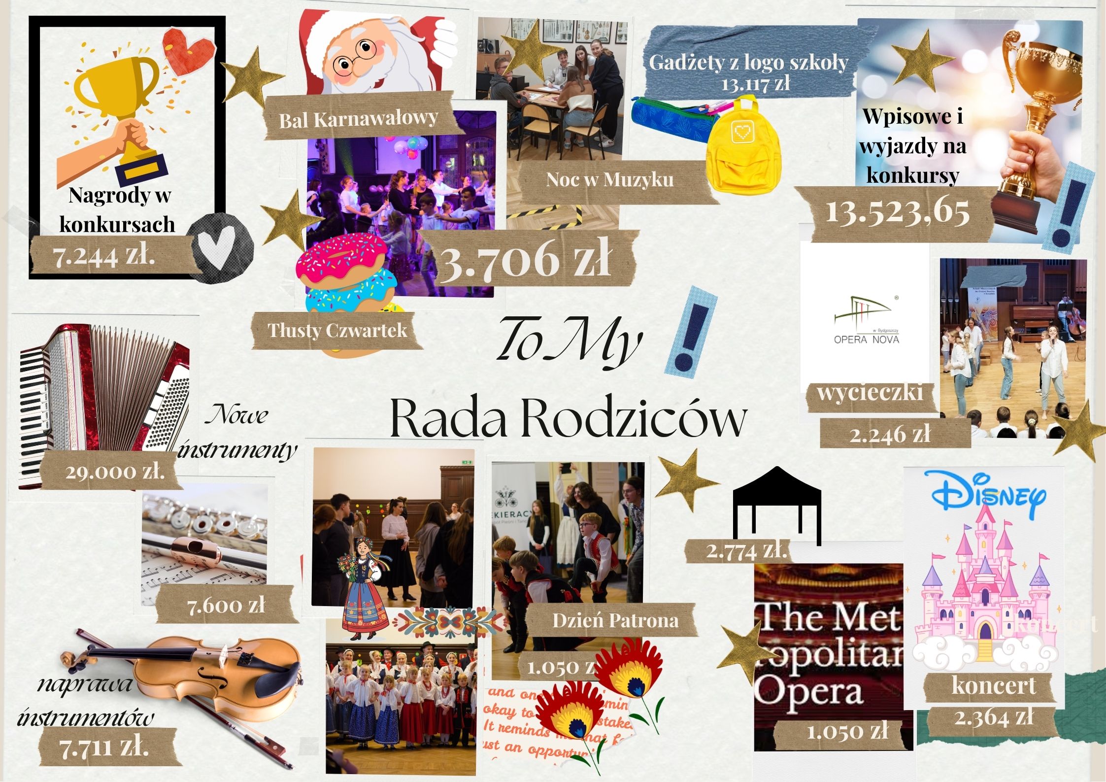 Z budżetu RR dofinansowywane są akcesoria muzyczne, zakup książek do biblioteki, remonty i strojenie instrumentów, imprezy i uroczystości szkolne, udział w konkursach i festiwalach (wpisowe, zakwaterowanie i transport).
