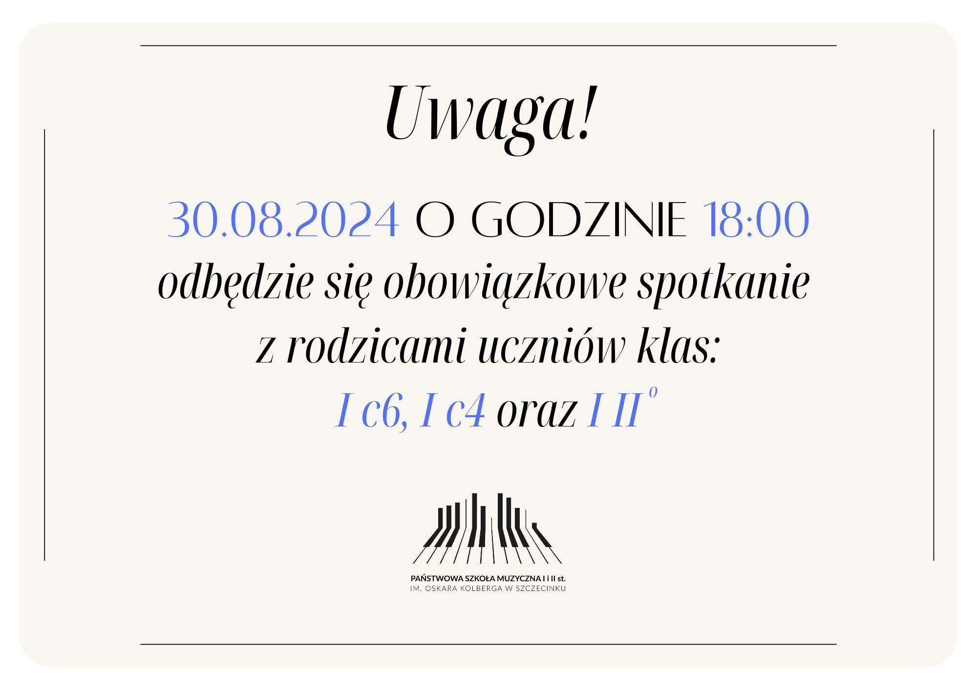 30 sierpnia 2024 w Państwowej Szkole Muzycznej odbędzie się obowiązkowe spotkanie z rodzicami uczniów klas: