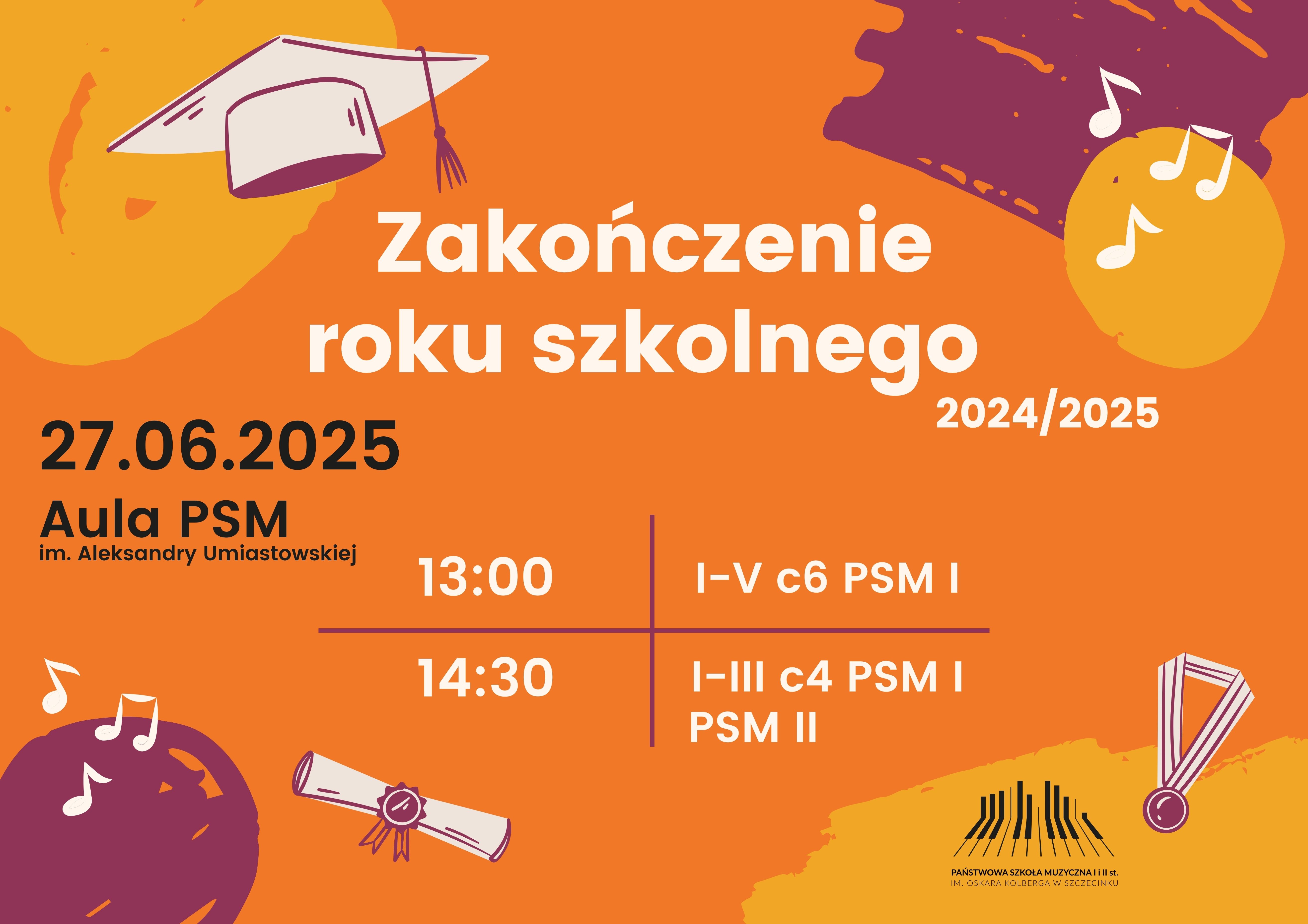 uroczyste zakończenie roku szkolnego odbędzie się 27.06 w Auli PSM,