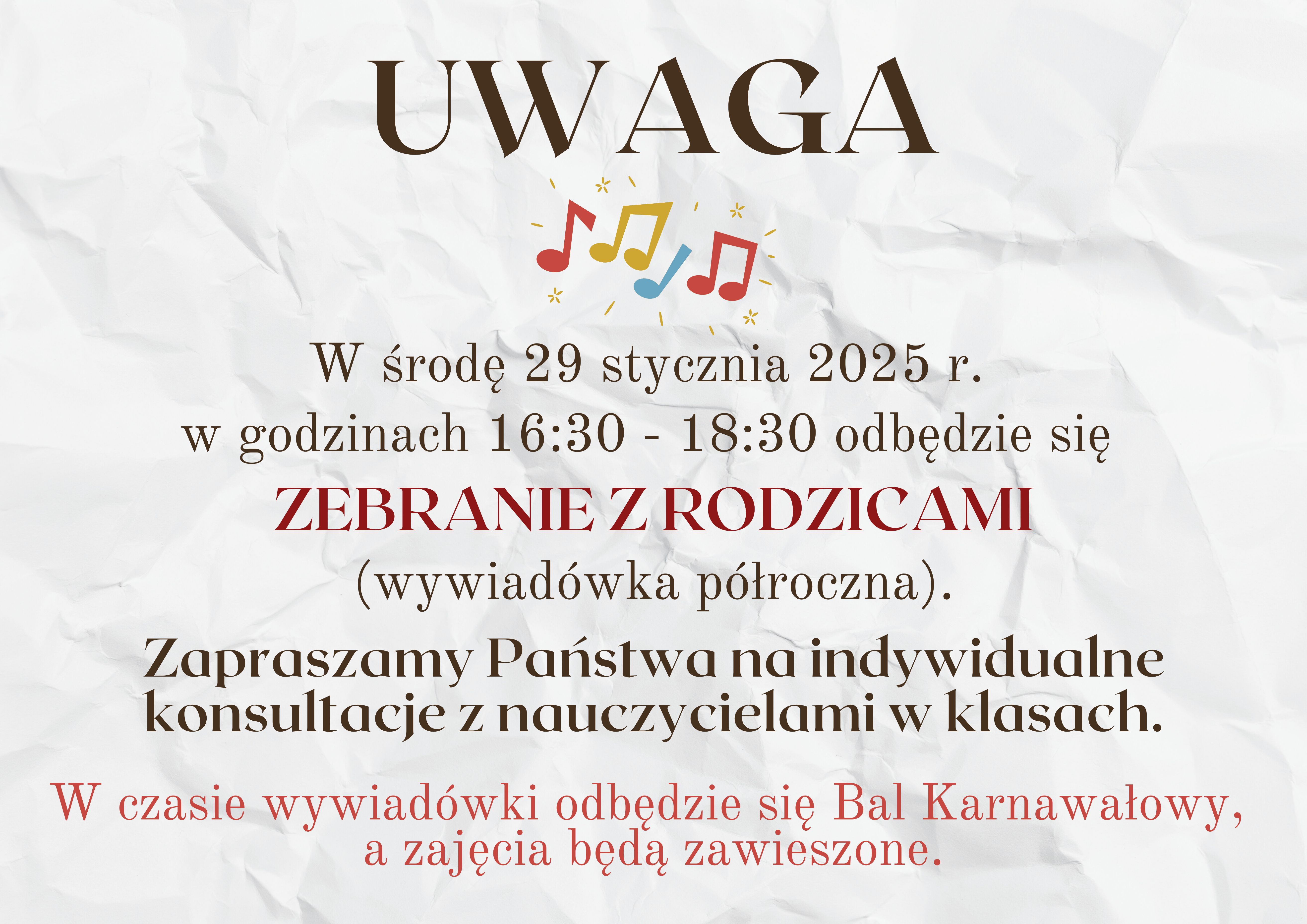 W czasie wywiadówki odbędzie się Bal Karnawałowy, a zajęcia będą zawieszone.