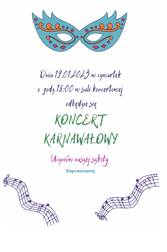 Koncert Karnawałowy - 19.01.2023 17.01.2023 Serdecznie zapraszamy! Zdjęcia (1) Pokaż zdjęcie 1 z galerii.
