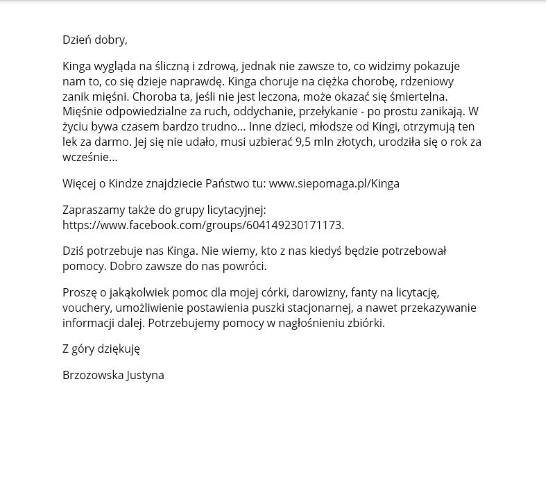 Podczas Koncertu odbędzie się zbiórka na rzecz chorej Kingi.