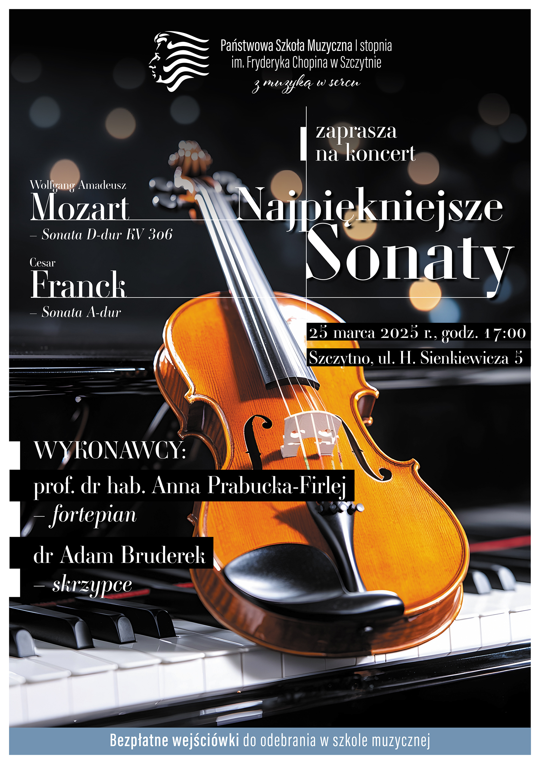 Już 25.03.2025 r. zapraszamy do sali koncertowej PSM na wyjątkowy koncert Najpiękniejsze sonaty w wykonaniu gdańskich artystów prof. dr hab. Anny Prabuckiej-Firlej (fortepian) oraz dr. Adama Bruderka (skrzypce). Koncert poprowadzi prof. Krzysztof Sperski. Bezpłatne wejściówki na to wydarzenie można odbierać w sekretariacie szkoły od 18.03.2025 r. w godz. 8:00-16:00.