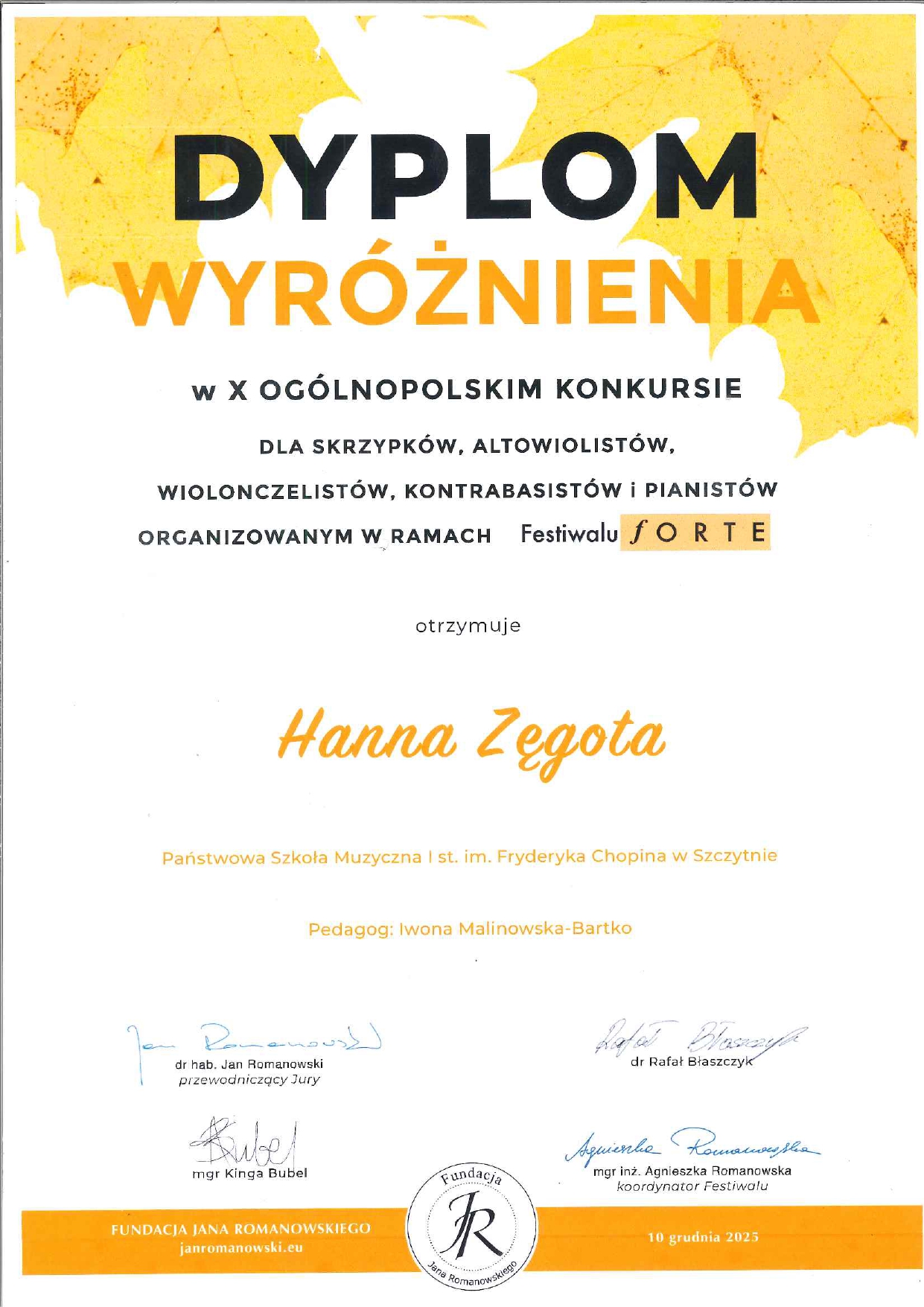 Uczennica Hanna Zęgota z klasy skrzypiec Iwony Malinowskiej-Bartko otrzymała wyróżnieniena X Ogólnopolskim konkurskie w ramach Festiwalu Forte. Akompaniował Tomasz Banul.