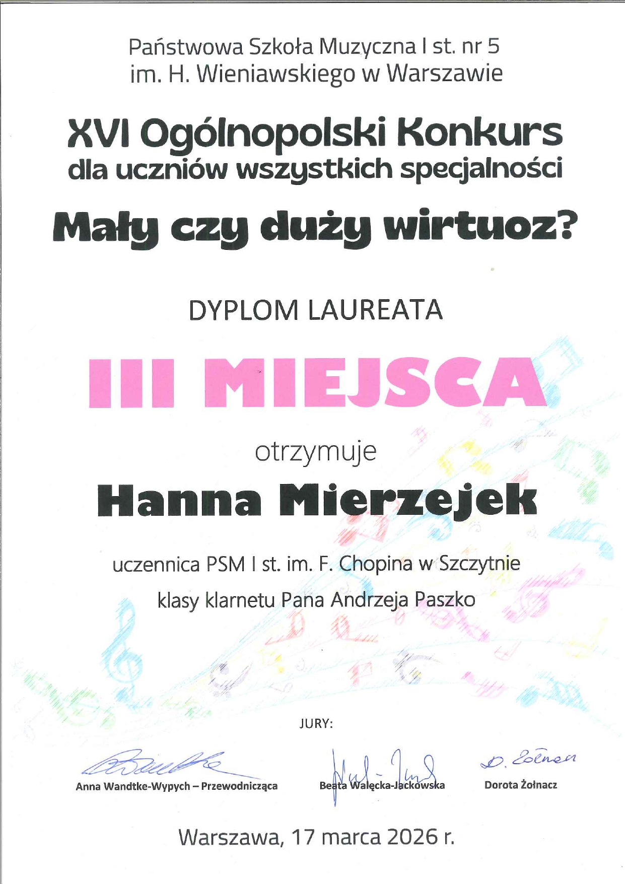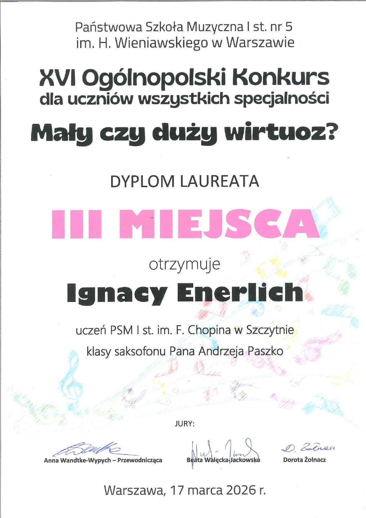 Hanna Mierzejek uczennica klasy klarnetu oraz Ignacy Enerlich uczeń klasy saksofonu nauczyciela Andrzeja Paszko zajęli III miejsce w XVI Ogólnopolskim Konkursie dla uczniów wszystkich specjalności "Mały czy duży wirtuoz?" Serdecznie gratulujemy!