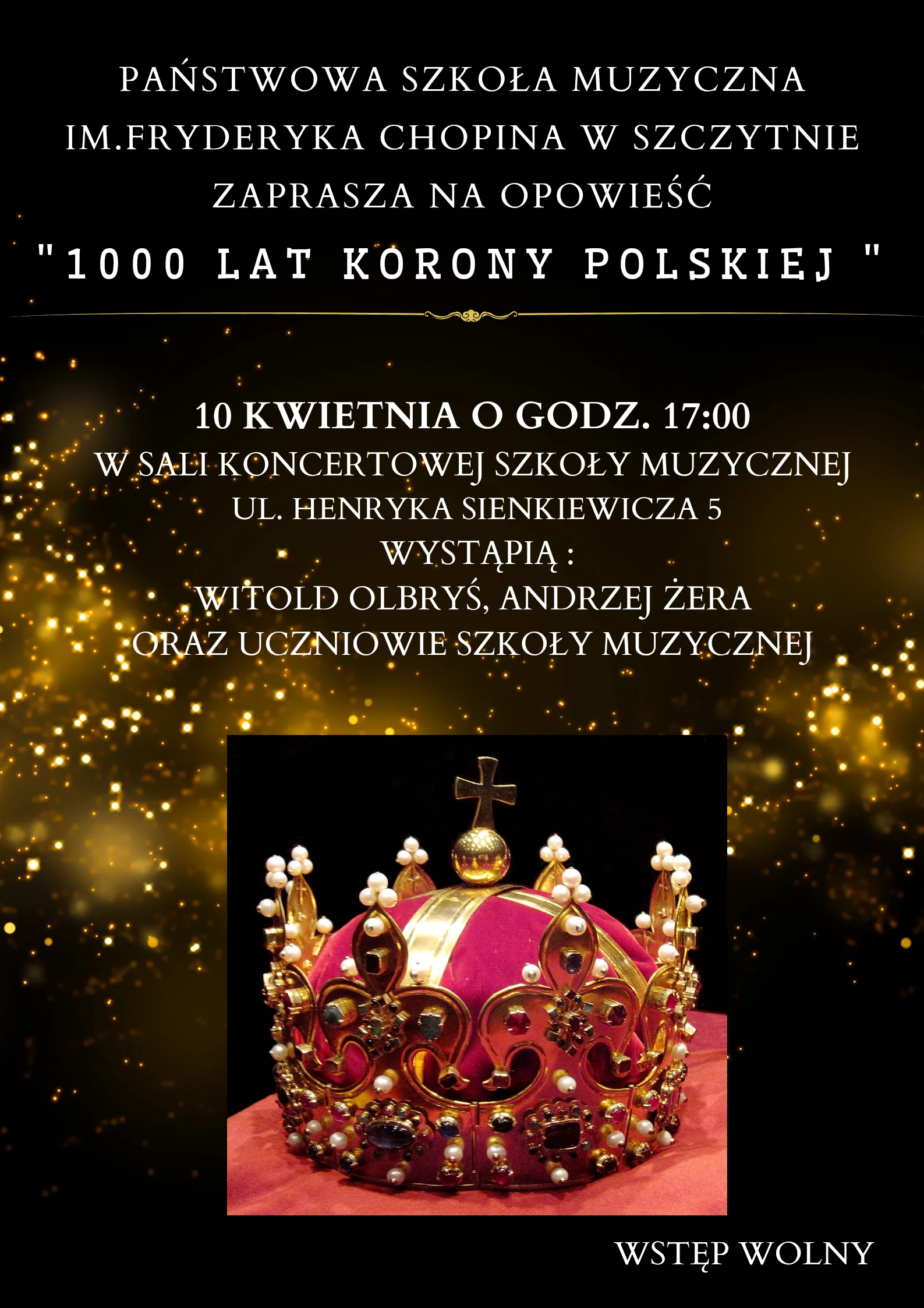 Zapraszamy w najbliższy czwartek 10 kwietnia do sali koncertowej naszej szkoły na opowieść "1000 lat Korony Polskiej". Szczegóły na plakacie. Wstęp wolny!