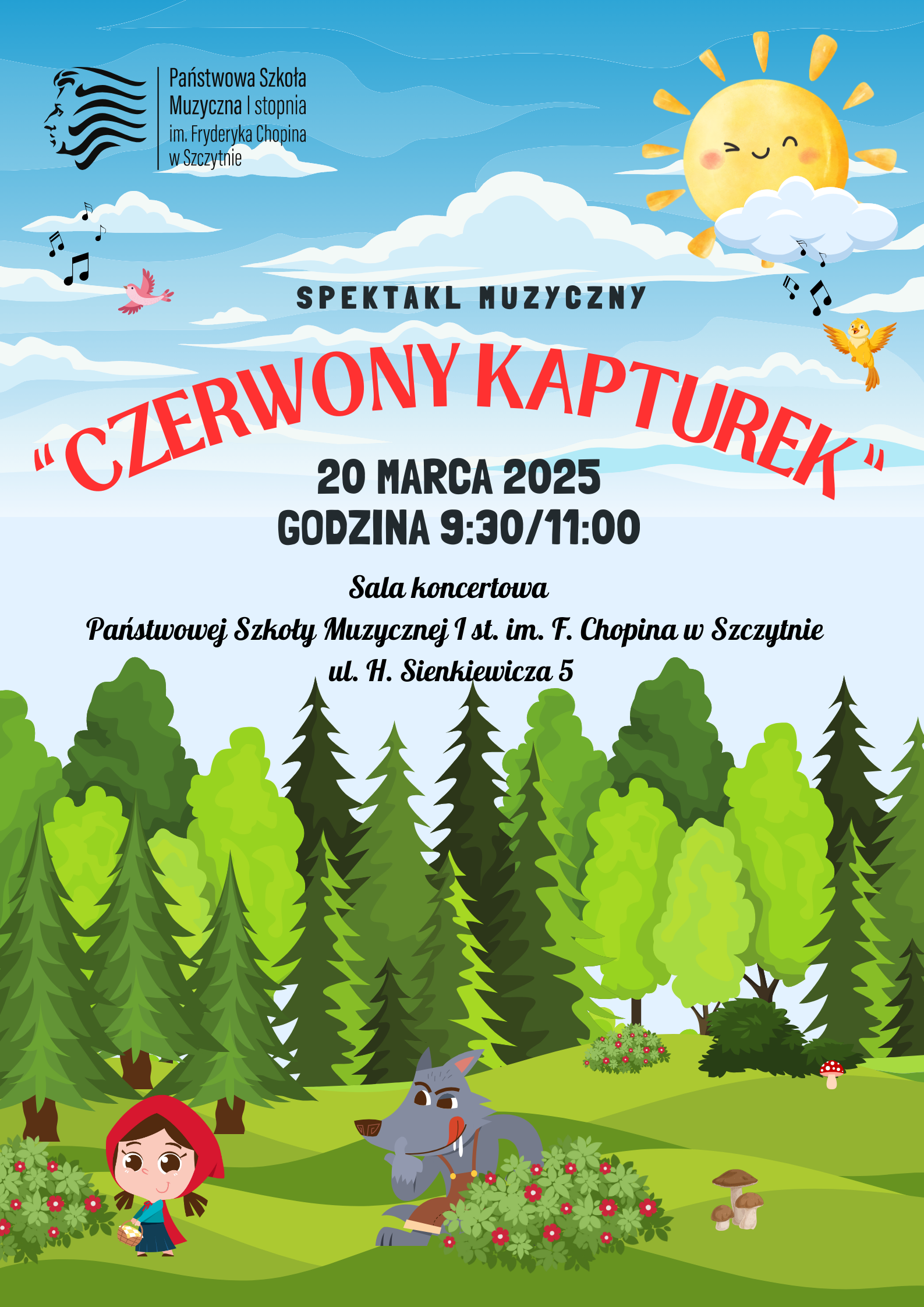 W najbliższy czwartek 20 marca 2025 r. w sali koncertowej PSM odbędzie się przedstawienie zamknięte - spektakl muzyczny pt. Czerwony Kapturek przygotowany przez uczniów i nauczycieli naszej szkoły dla sześciolatków z miejskich i gminnych przedszkoli.