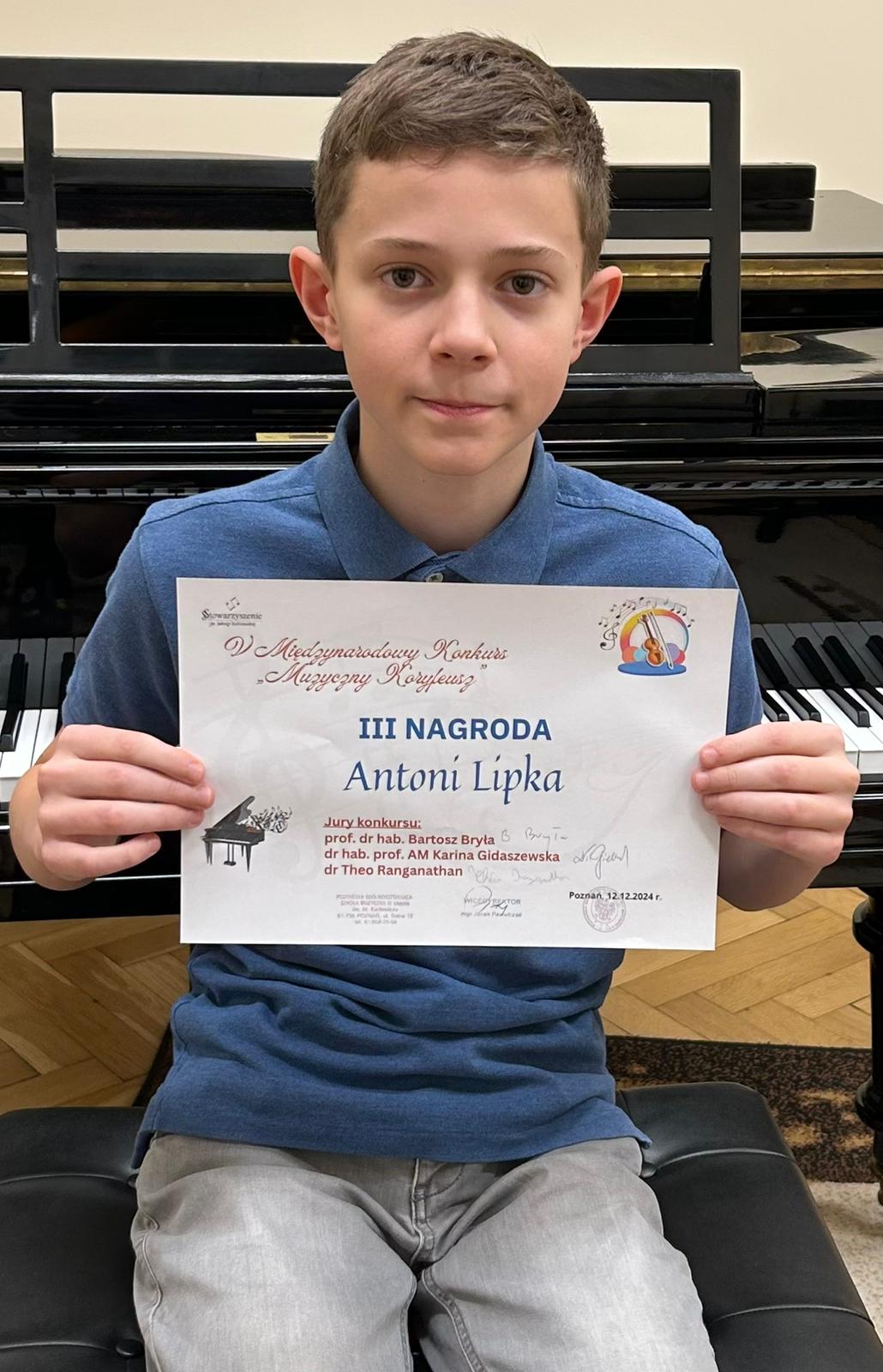12 grudnia 2024 roku Antoni Lipka uczeń klasy fortepianu p. Elżbiety Żotkiewicz wziął udział w V Międzynarodowym Konkursie "Muzyczny Koryfeusz" zorganizowanym przez Poznańską Ogólnokształcącą Szkołę Muzyczną II stopnia im. M. Karłowicza w Poznaniu. Uczeń zdobył III Nagrodę w Konkursie. Gratulujemy sukcesu Uczniowi oraz jego Nauczycielce.