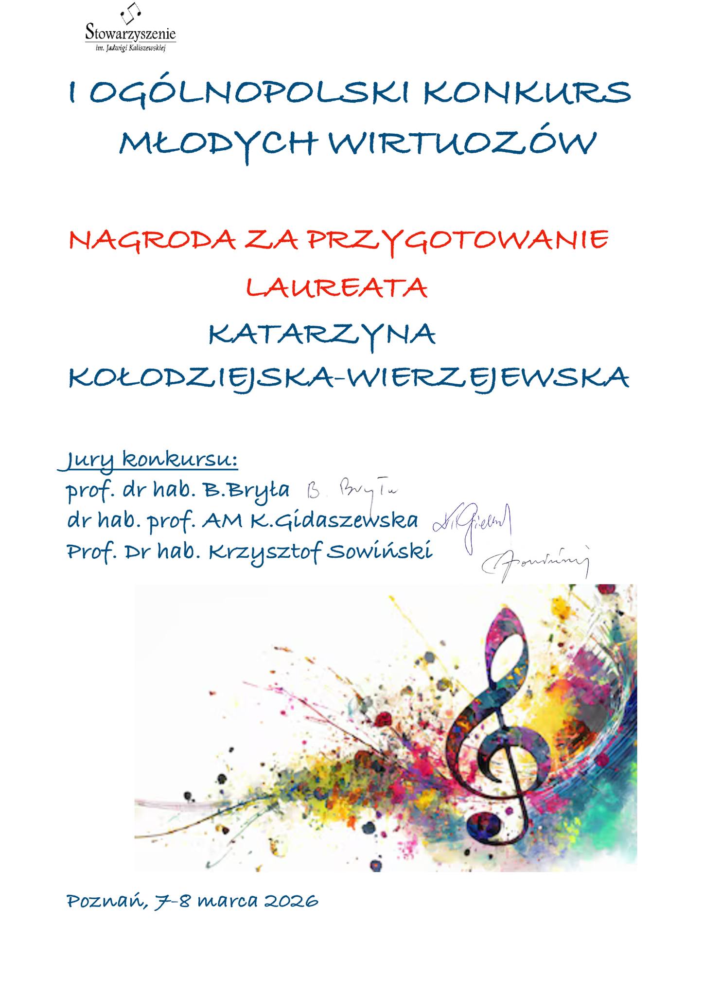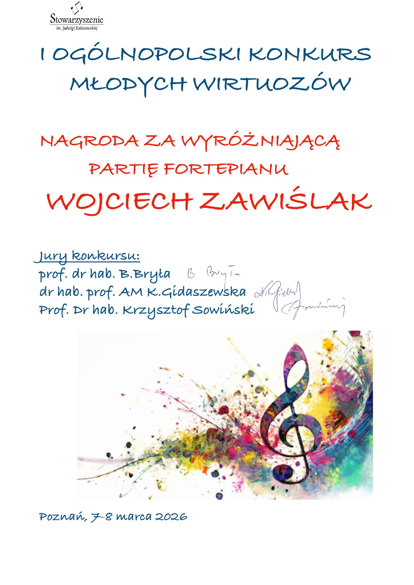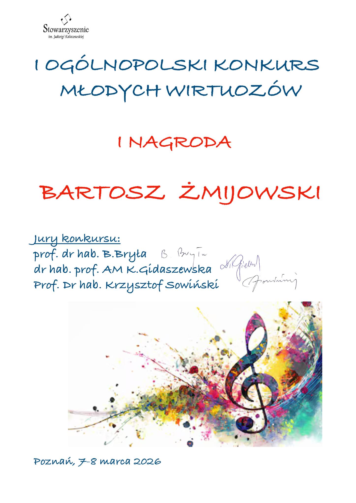 W dniach 7-8.03.2026 r. w Poznaniu odbył się I Ogólnopolski Konkurs „Młodzi Wirtuozi” zorganizowany przez POSM II st. im. M. Karłowicza w Poznaniu i Stowarzyszenia im. Jadwigi Kaliszewskiej, w którym wziął udział nasz uczeń Bartosz Żmijowski przygotowany przez panią Katarzynę Kołodziejską-Wierzejewską akompaniował mu pan Wojciech Zawiślak. Bartosz zdobył I nagrodę w III grupie. Serdecznie gratulujemy.