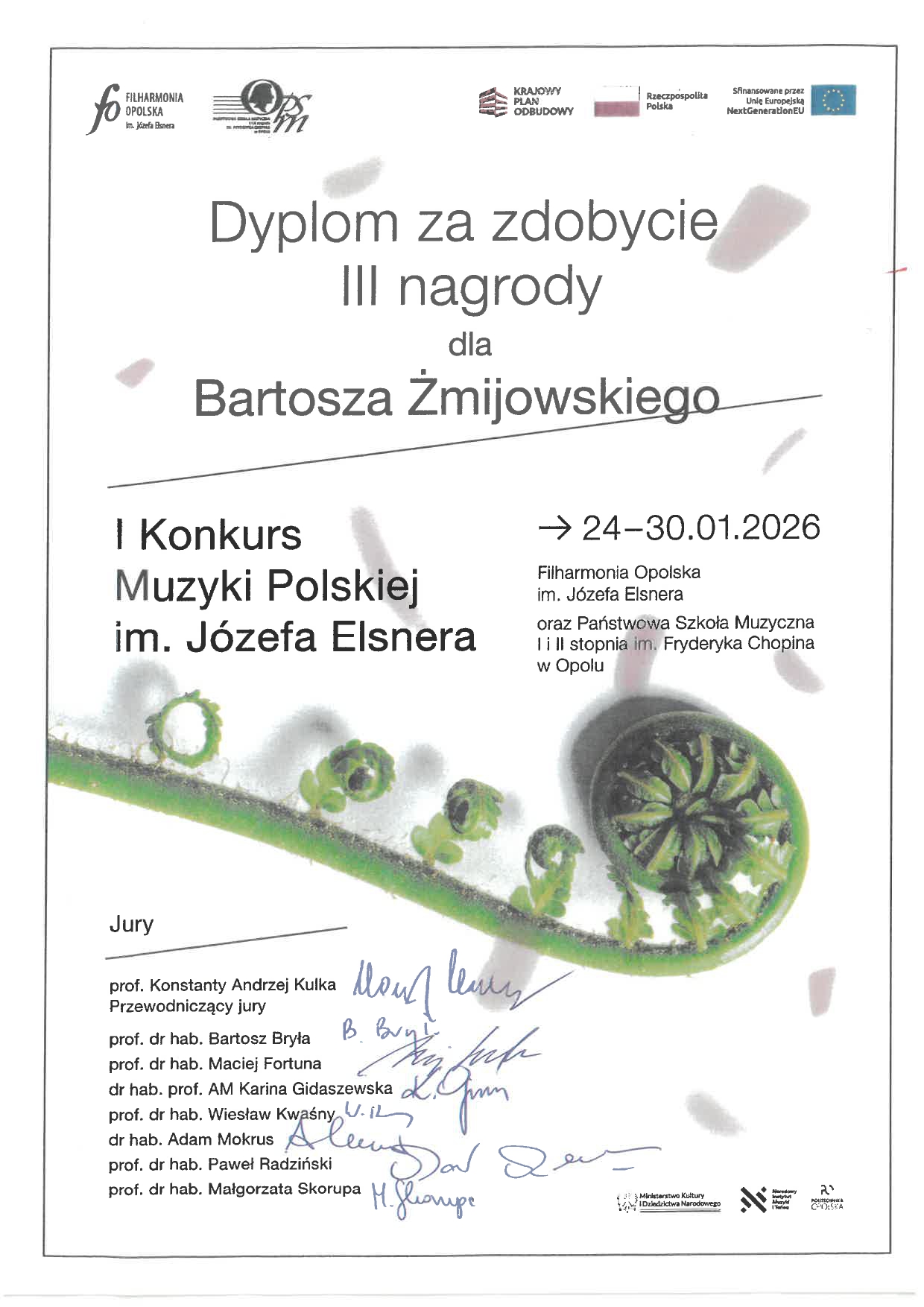 Dyplom za zdobycie III nagrody dla Bartosza Żmijowskiego z klasy pani Katarzyny Kołodziejskiej - Wierzejewskiej. I Konkurs Muzyki Polskiej im. Józefa Elsnera. w Opolu.