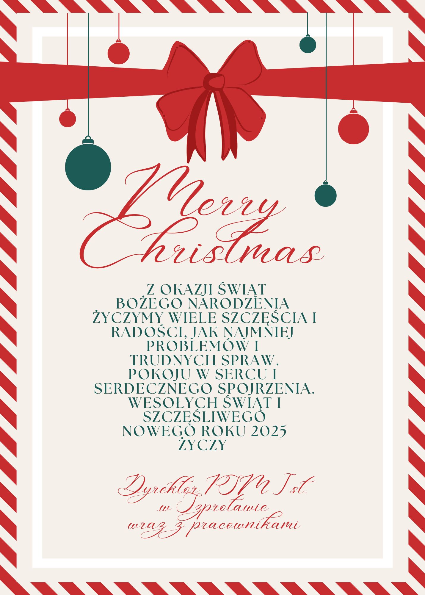 Z okazji Świąt Bożego Narodzenia życzymy wiele szczęścia i radości, jak najmniej problemów i trudnych spraw, pokoju w sercu i serdecznego spojrzenia. Wesołych Świąt i szczęśliwego Nowego Roku 2025 życzy Dyrektor PSM I stopnia w Szprotawie wraz z pracownikami.