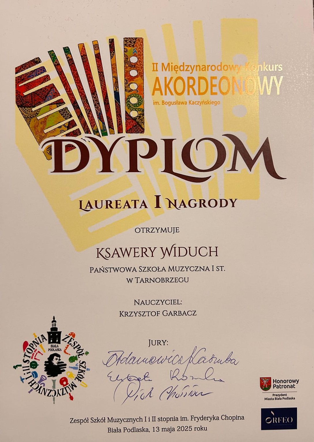 Ksawery Widuch z klasy akordeonu Krzysztofa Garbacza laureatem I miejsca II Międzynarodowego Konkursu Akordeonowego im. Bogusława Kaczyńskiego w Białej Podlaskiej. Organizatorem wydarzenia był Zespół Szkół Muzycznych I i II stopnia im. Fryderyka Chopina w Białej Podlaskiej, Prezydent Miasta Biała Podlaska oraz Fundacja ORFEO im. Bogusława Kaczyńskiego. W jury konkursu zasiadali wykładowcy wyższych uczelni muzycznych, wybitni pedagodzy i wykonawcy: prof. dr hab. Teresa Kaszuba z Akademii Muzycznej w Poznaniu – przewodnicząca jury oraz prof. dr hab. Elżbieta Rosińska z Akademii Muzycznej w Gdańsku i prof. dr hab. Piotr Chołołowicz z Akademii Muzycznej w Katowicach.