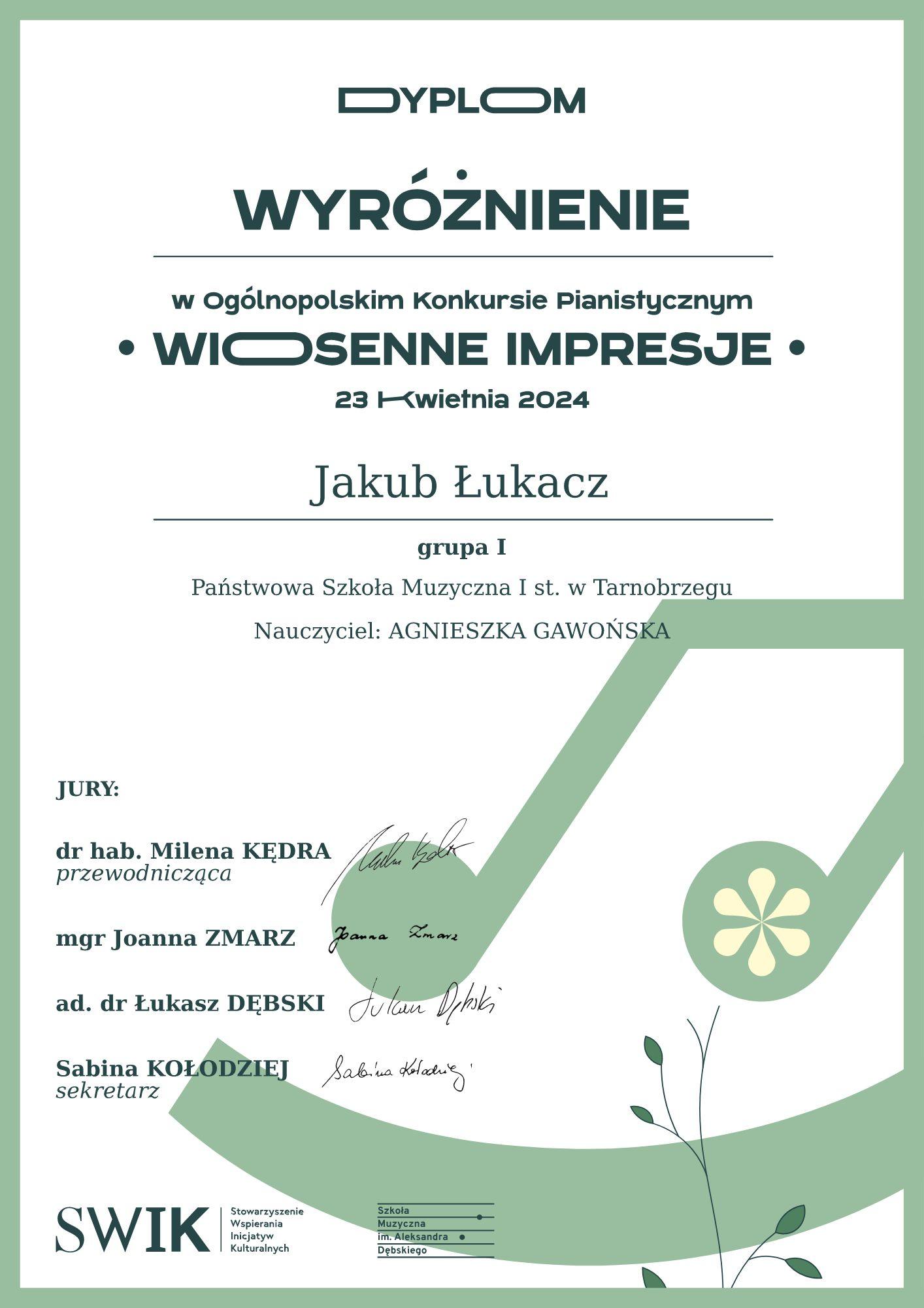 Jakub Łukacz z klasy fortepianu Agnieszki Gawrońskiej zdobył wyróżnienie.