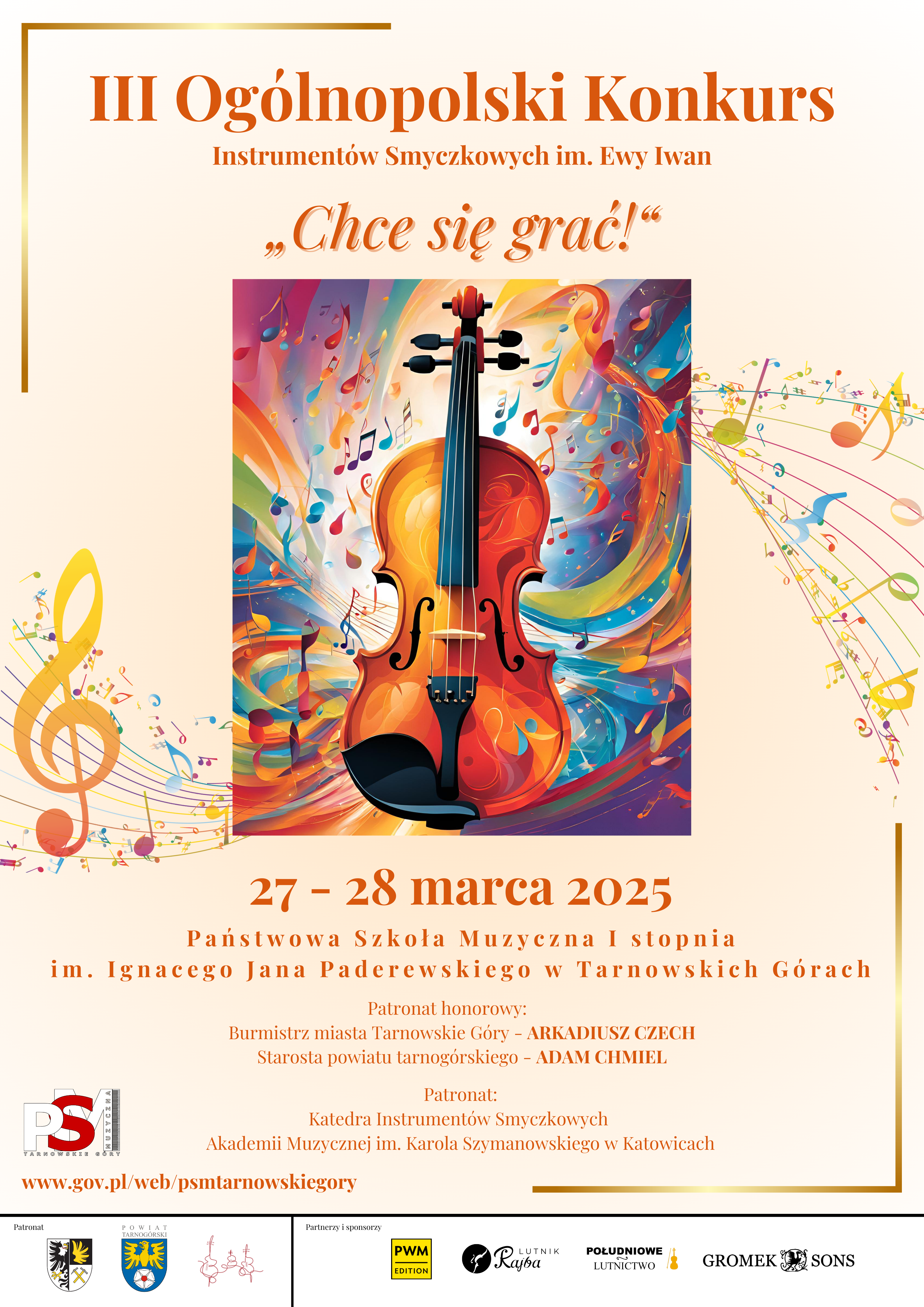 Zapraszamy do udziału w III Ogólnopolskim Konkursie Instrumentów Smyczkowych im. Ewy Iwan, który odbędzie się 27 i 28 marca 2025 w siedzibie Państwowej Szkoły Muzycznej I stopnia im. Ignacego Jana Paderewskiego w Tarnowskich Górach .