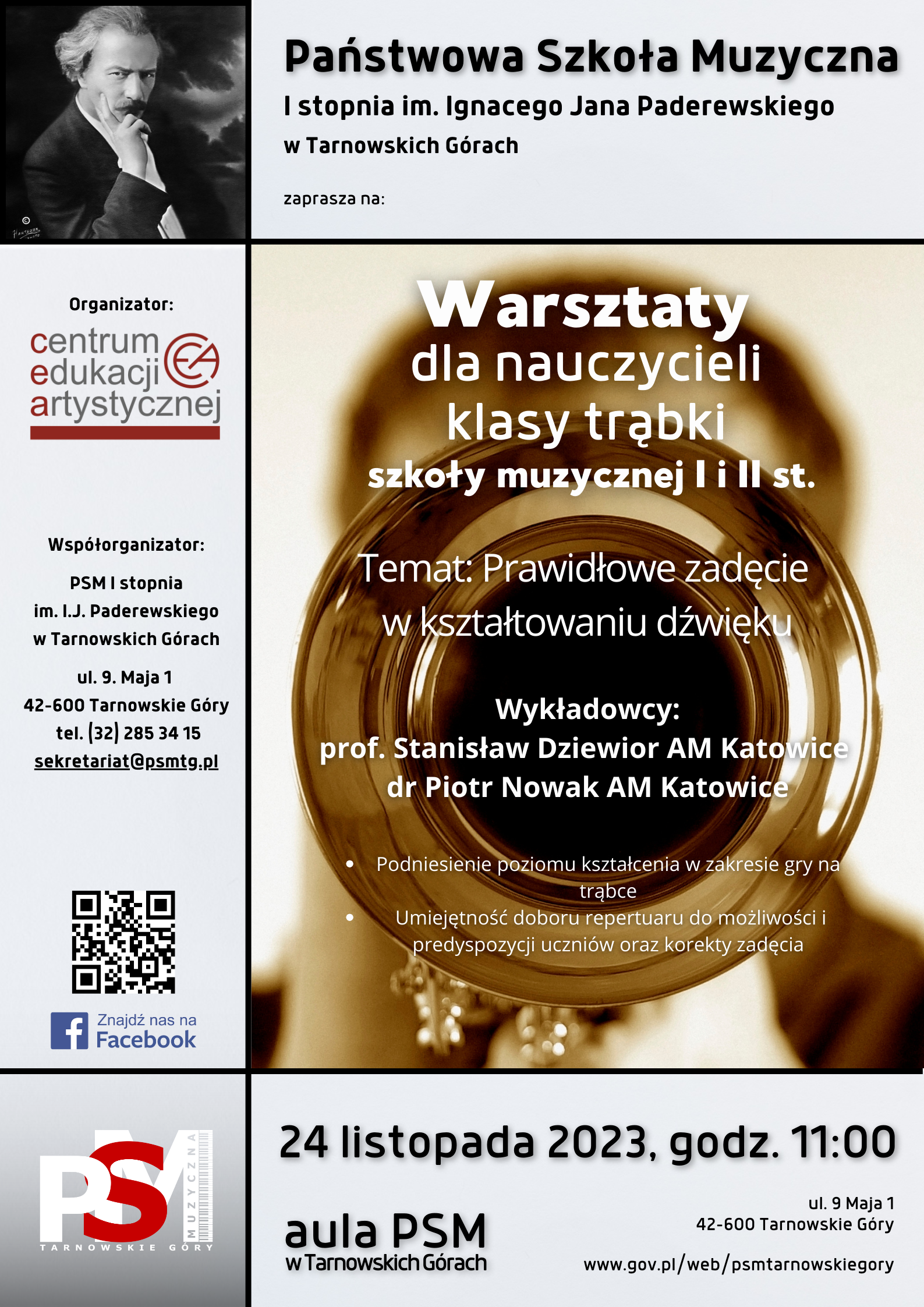 im. Ignacego Jana Paderewskiego w Tarnowskich Górach zapraszają na warsztaty dla nauczycieli klasy trąbki szkół muzycznych I i II stopnia w ramach planowanych działań na rzecz podnoszenia poziomu kształcenia artystycznego w zakresie doskonalenia zawodowego nauczycieli.
