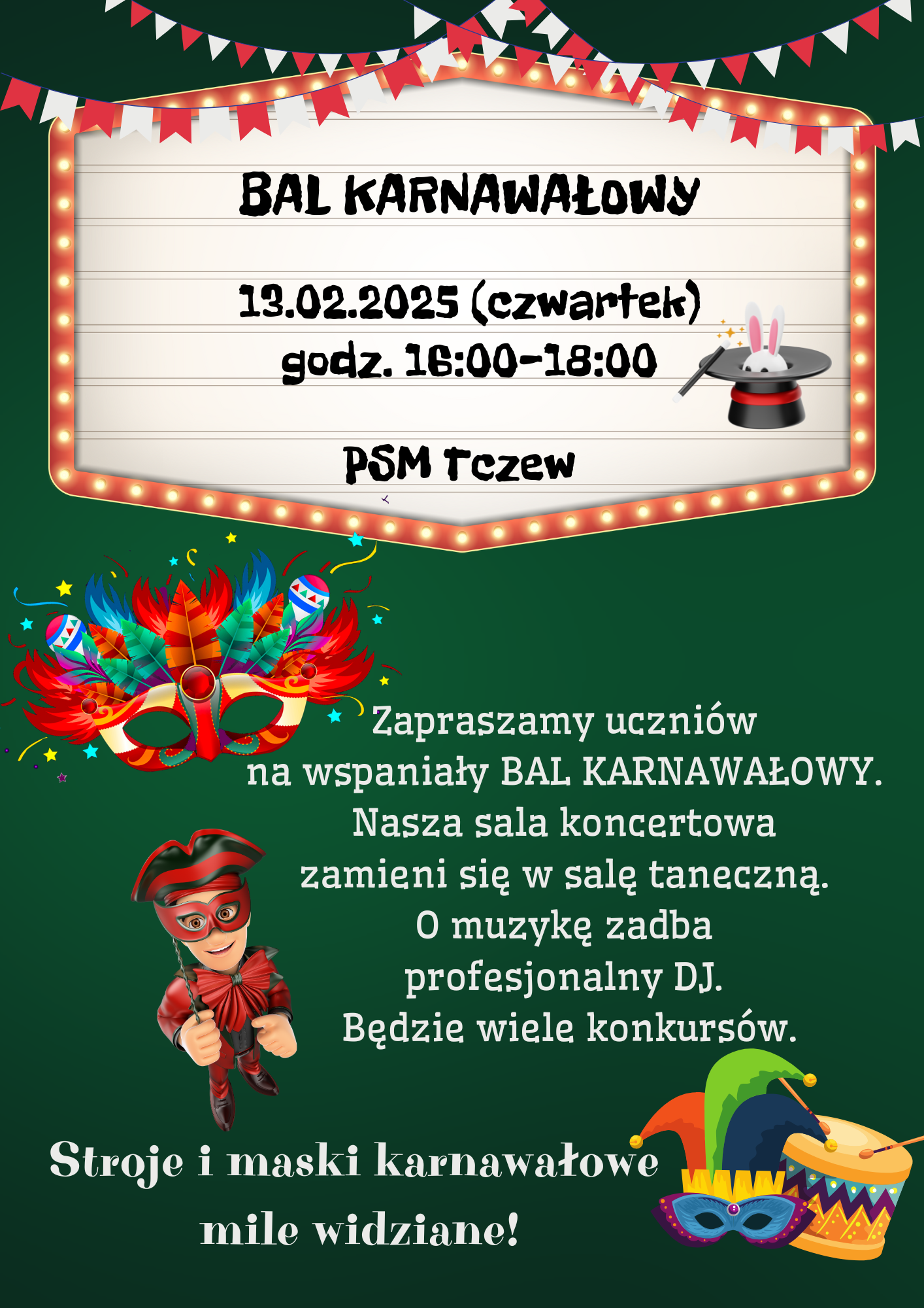13 lutego 2025 r. zapraszamy naszych uczniów na wielki BAL KARNAWAŁOWY! Od godziny 16:00 do 18:00 nasza sala koncertowa zamieni się w salę taneczną. O muzykę zadba profesjonalny DJ. Podczas imprezy będzie wiele konkursów. Jak karnawał, to karnawał... mile widziane stroje i maski karnawałowe.