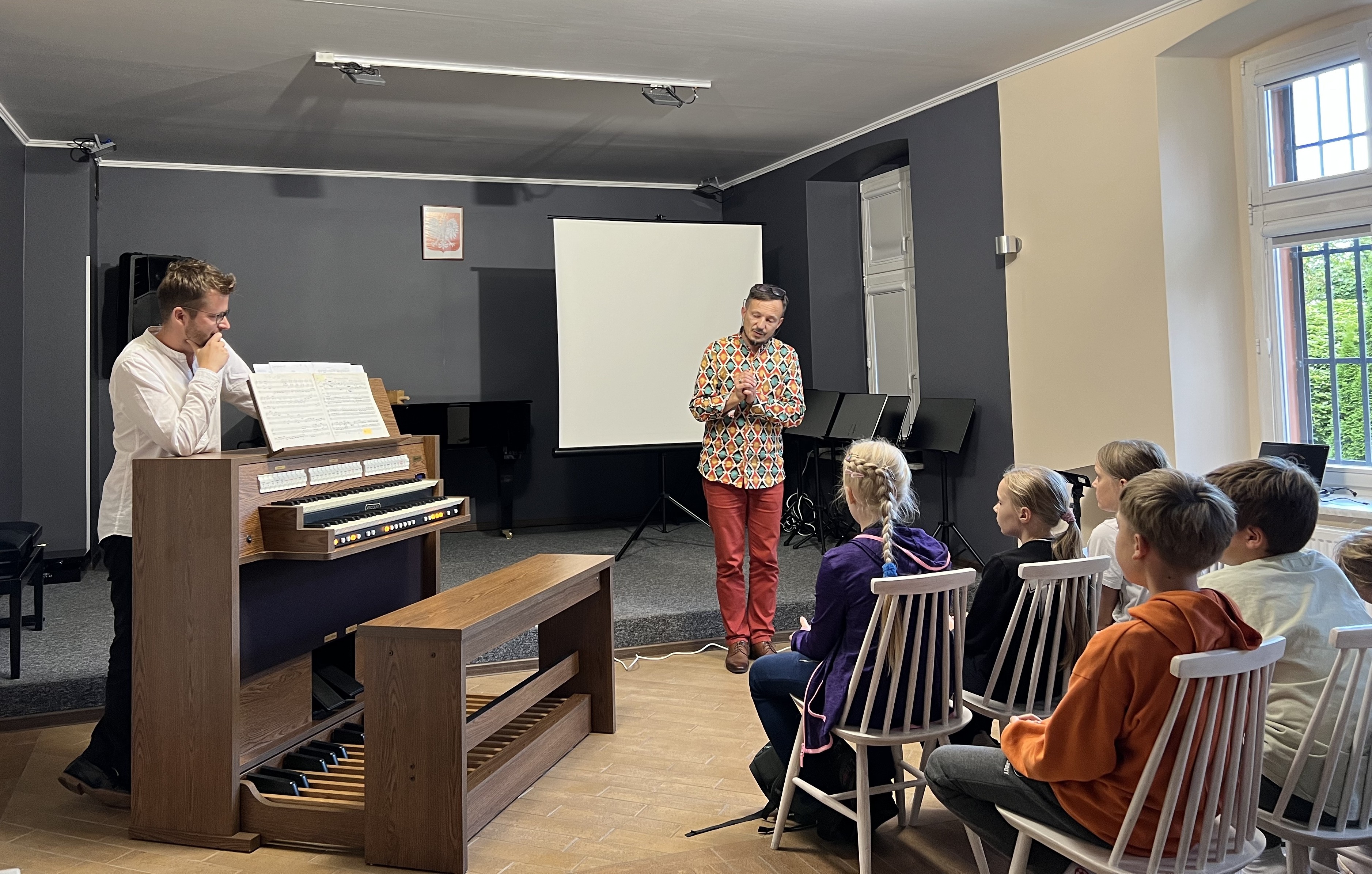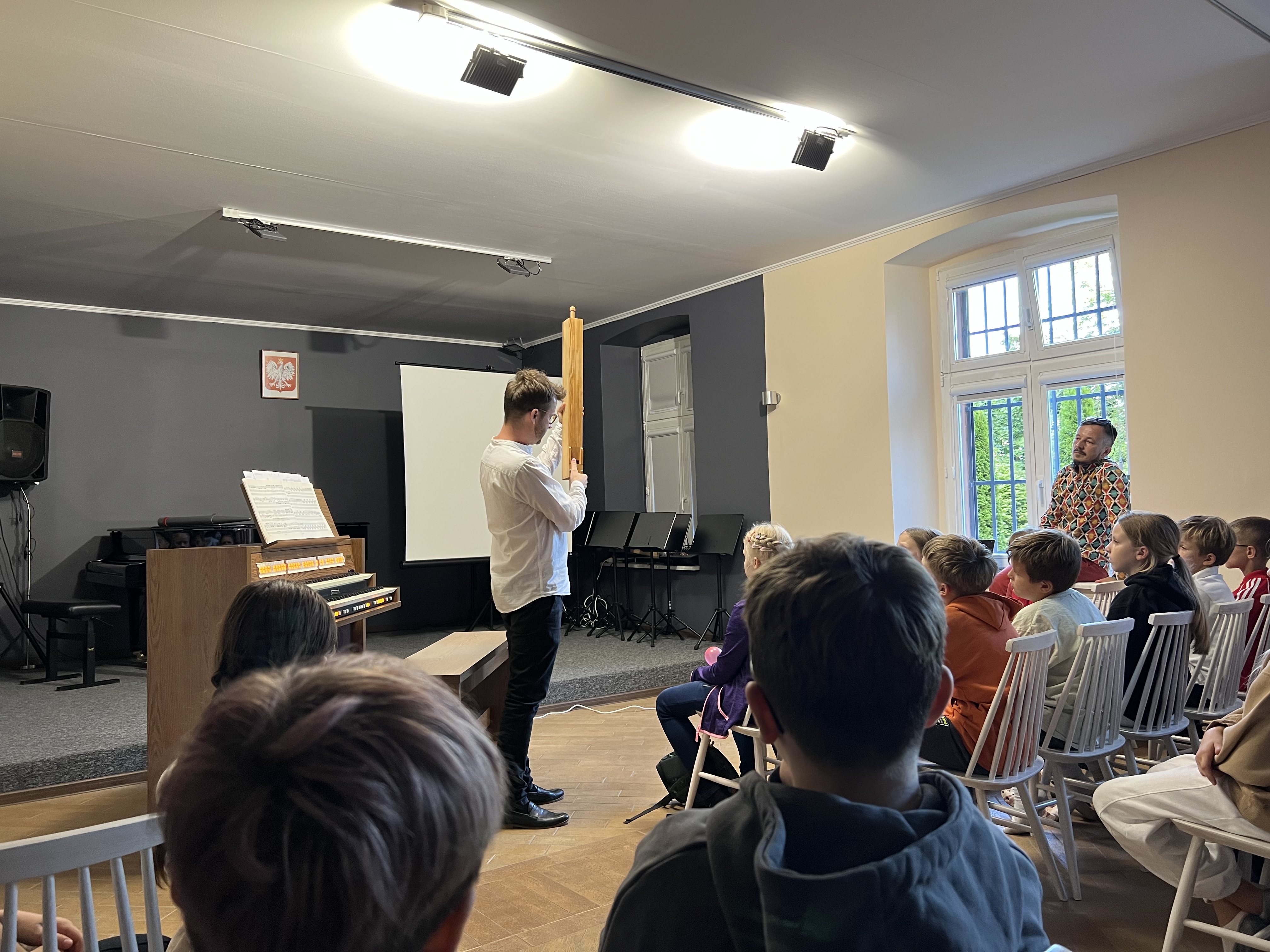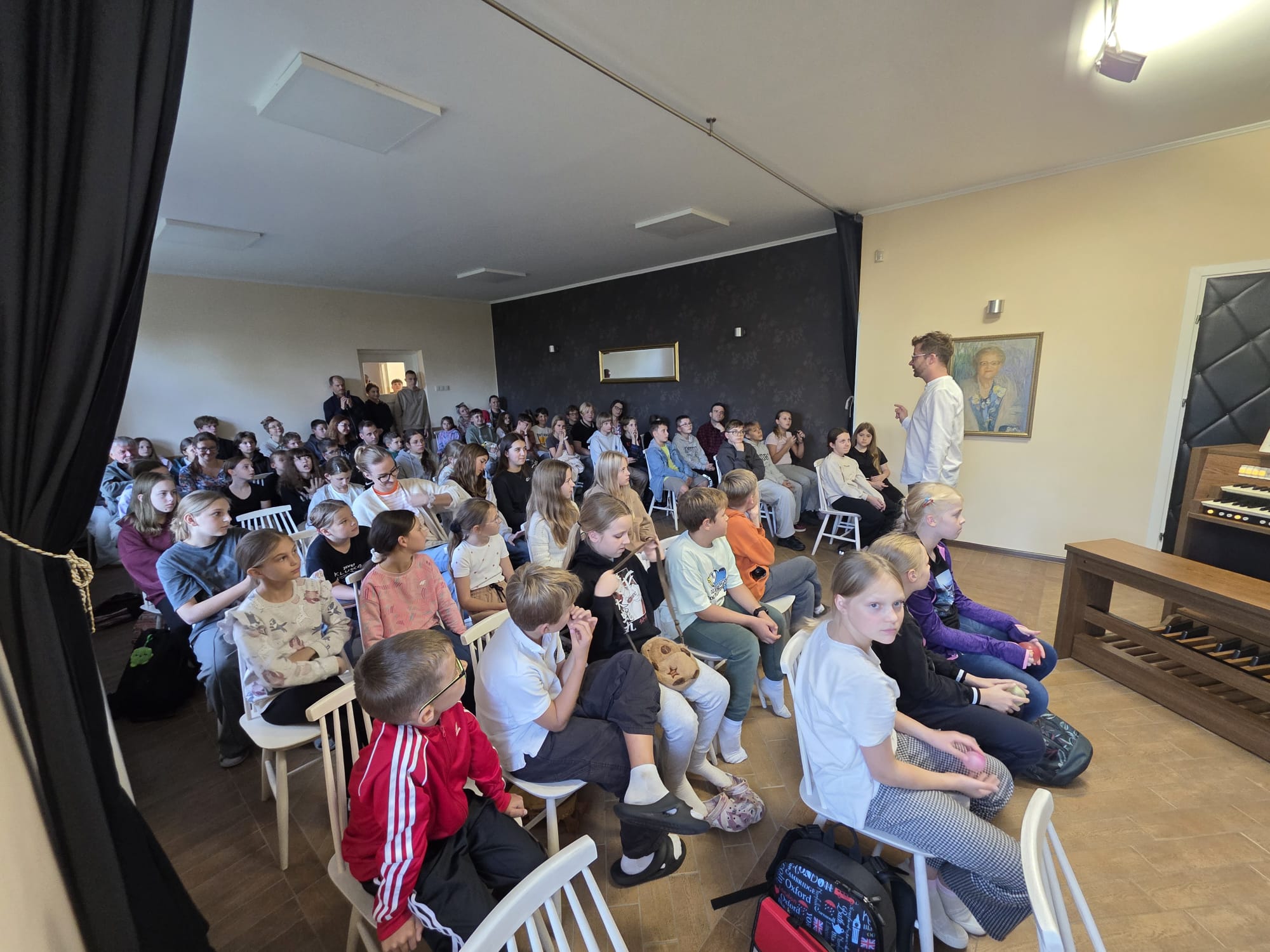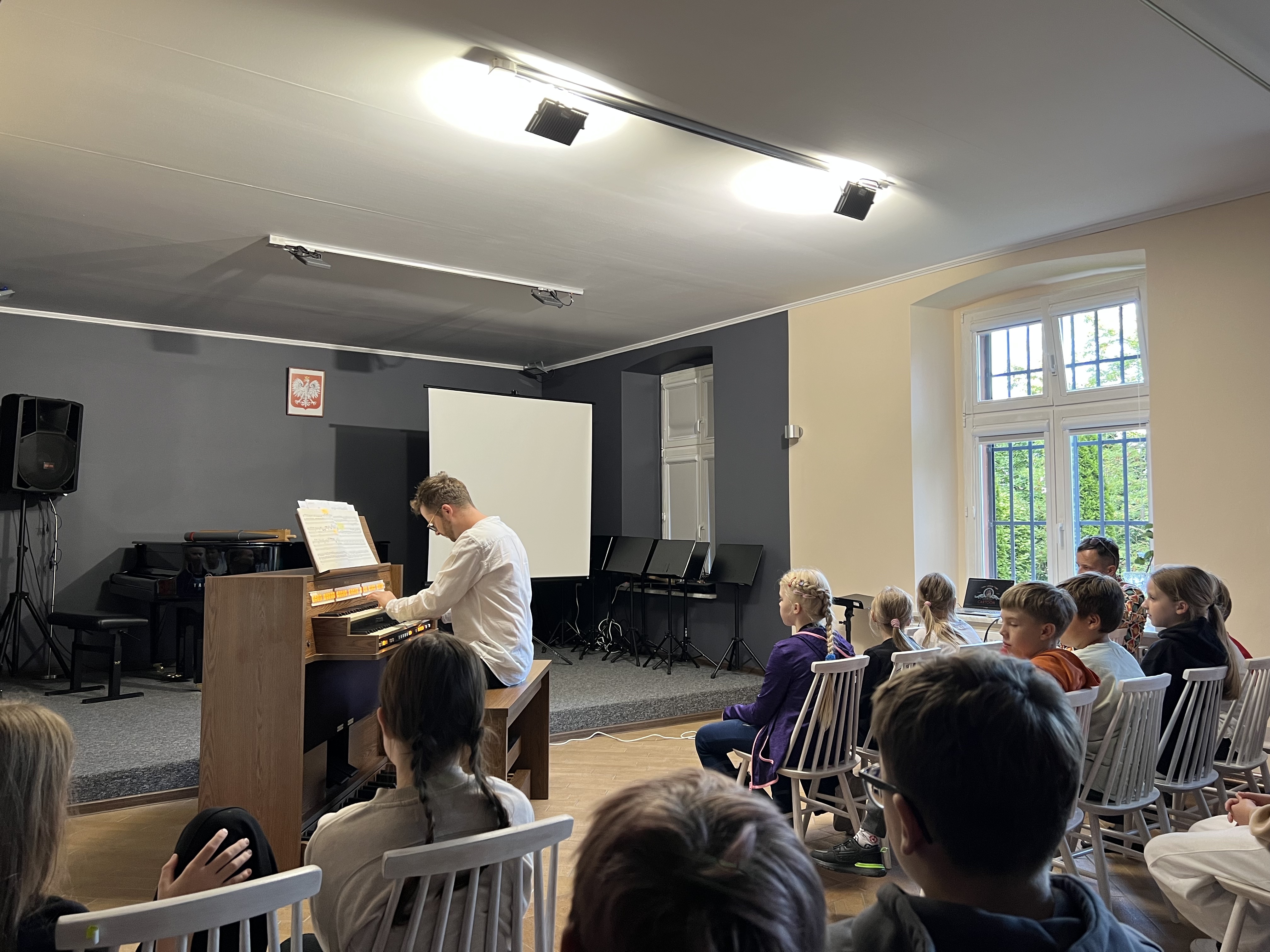 24 września 2025r. naszą salę koncertową wypełniły dźwięki organów, a to za sprawą Koncertu edukacyjnego, który prowadził dr Maciej Zakrzewski. Specjalnie na tę okoliczność nasz artysta przywiózł swój instrument domowy, do codziennego ćwiczenia - organy elektroniczne. Uczniowie dowiedzieli się wielu ciekawostek o tym instrumencie dętym. Zobaczyli i usłyszeli na żywo jak włącza się poszczególne rejestry, jak pracują manuały, a także jak wydobywa się dźwięk z piszczałek w organach np. takich jak widzimy w salach koncertowych i kościołach. Było to bardzo ciekawe doświadczenie.