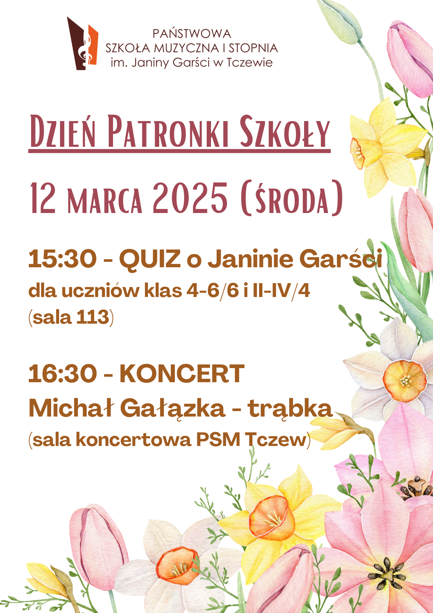 12 marca 2025 r. zapraszamy na obchody Dnia Patronki Szkoły. Z tej okazji uczniów klas 4-6 cyklu 6-letniego i II-IV cyklu 4-letniego zapraszamy na godzinę 15:30 na QUIZ o Janinie Garści (sala 113). Natomiast wszystkich uczniów, nauczycieli i melomanów zapraszamy na godzinę 16:30 na KONCERT Michała Gałązki - trębacza, ucznia SM II st. w Gdyni (sala koncertowa PSM Tczew).