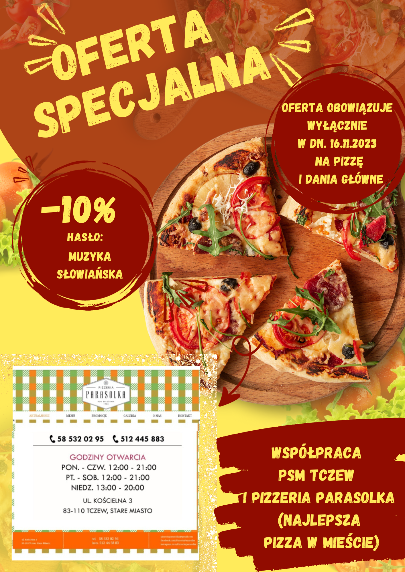 "OFERTA SPECJALNA" - do współpracy z Państwową Szkołą Muzyczną I stopnia im. Janiny Garści w Tczewie przystąpiła Pizzeria Parasolka (najlepsza pizza w mieście), która w dniu Festiwalu Muzyki Słowiańskiej (16.11.2023r.) oferuje 10% zniżki na pizzę i dania główne. Zniżka na hasło: MUZYKA SŁOWIAŃSKA. Pizzeria Parasolka jest niedaleko szkoły - Tczew, ul. Kościelna 3. Szczegóły na plakacie w galerii poniżej.