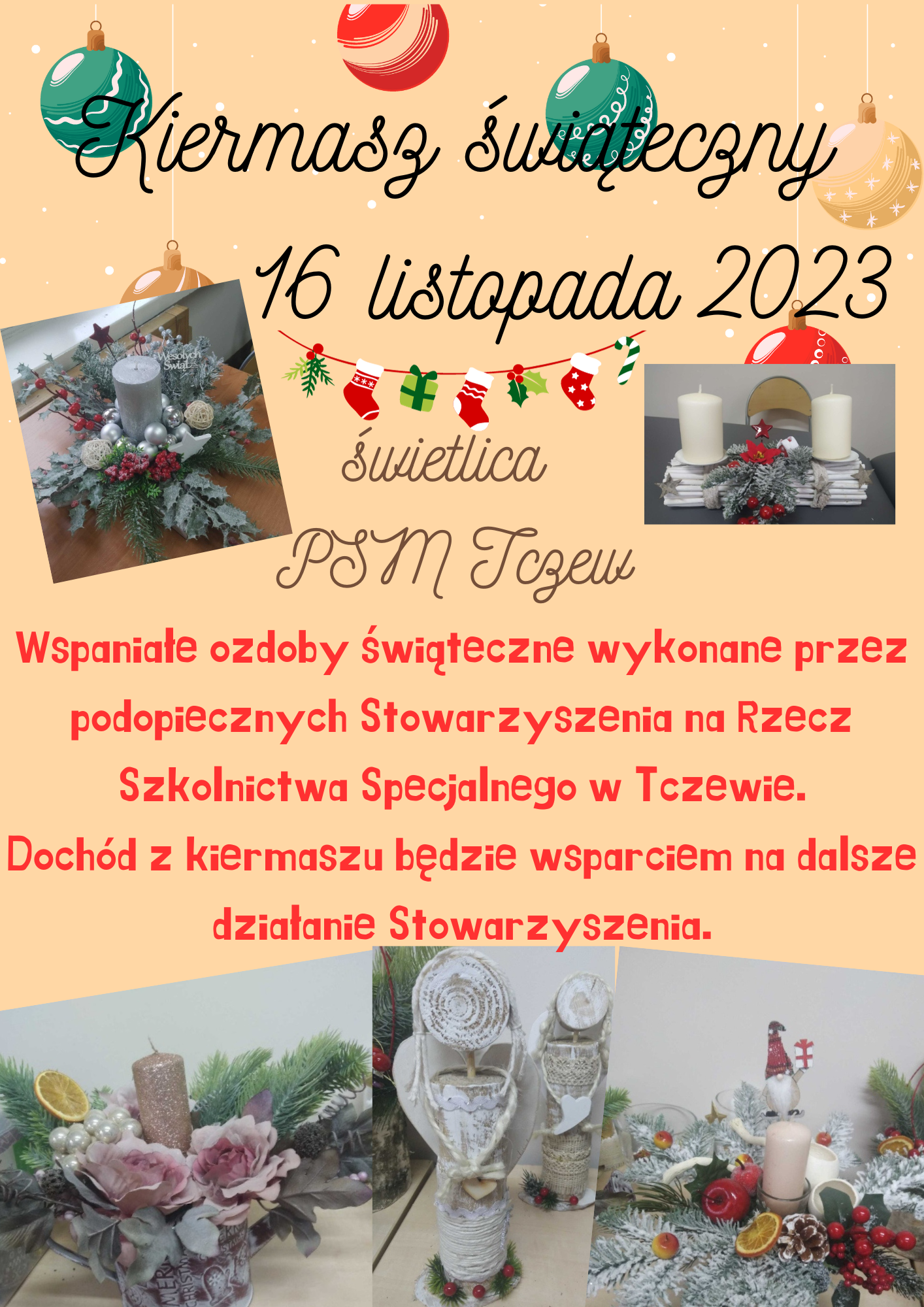 Podczas FESTIWALU MUZYKI SŁOWIAŃSKIEJ odbędzie się "Kiermasz świąteczny" - kiermasz rękodzieła, do nabycia wspaniałe świąteczne ozdoby, stroiki, bombki i wiele innych prac autorstwa podopiecznych Stowarzyszenia na Rzecz Szkolnictwa Specjalnego w Tczewie. Dochód z kiermaszu pozowli na dalsze wsparcie rozwoju podopiecznych Stowarzyszenia.