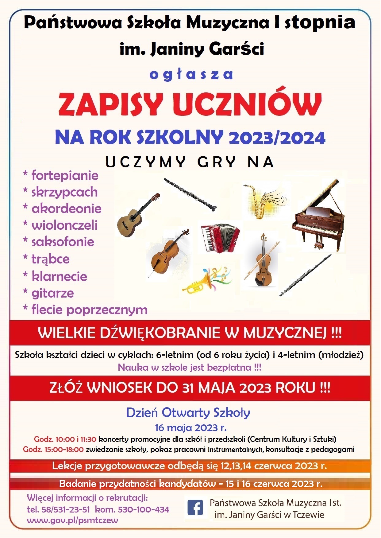 - od godziny 15:00 do 18:00 zapraszamy wszystkie zainteresowane dzieci i młodzież wraz ze swoimi rodzicami na Dzień otwarty w szkole muzycznej – ul. Plac św. Grzegorz 6. W tym czasie będzie można zwiedzić pracownie instrumentalne, porozmawiać z pedagogami na temat wyboru instrumentu, a nawet spróbować wydobyć dźwięk z wybranego instrumentu.