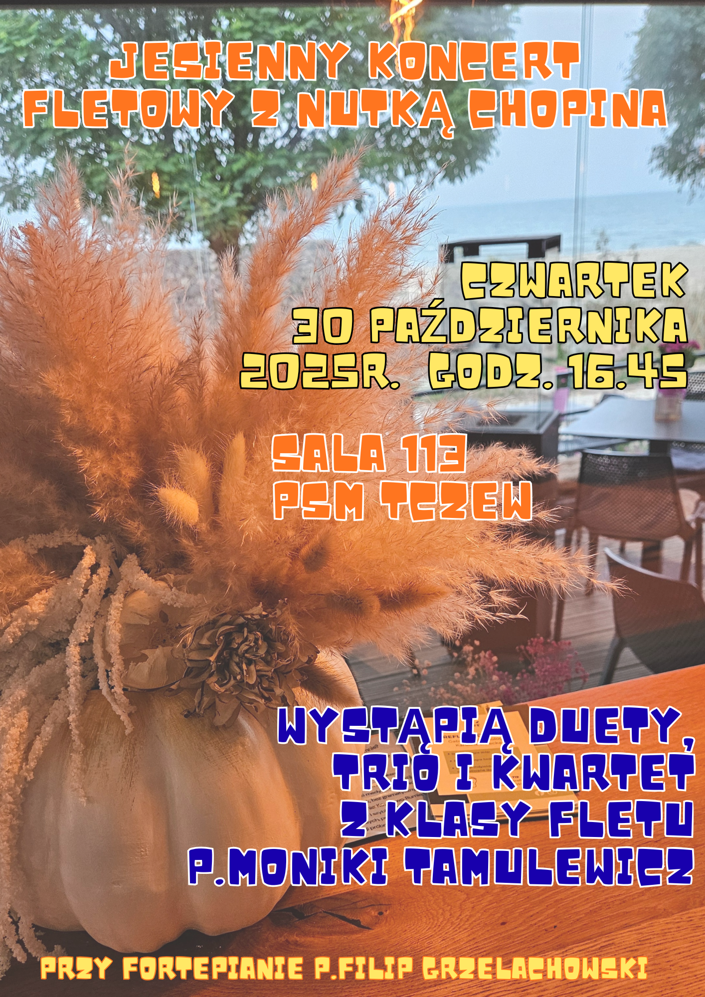 "Jesienny koncert fletowy z nutką Chopina", to wydarzenie które odbędzie się 30 października 2025 r. (czwartek) w sali 113 PSM Tczew. Podczas Koncertu usłyszymy duety, trio i kwartet z klasy fletu p. Moniki Tamulewicz, a uczniom przy fortepianie towarzyszyć będzie p. Filip Grzelachowski. Zapraszamy!