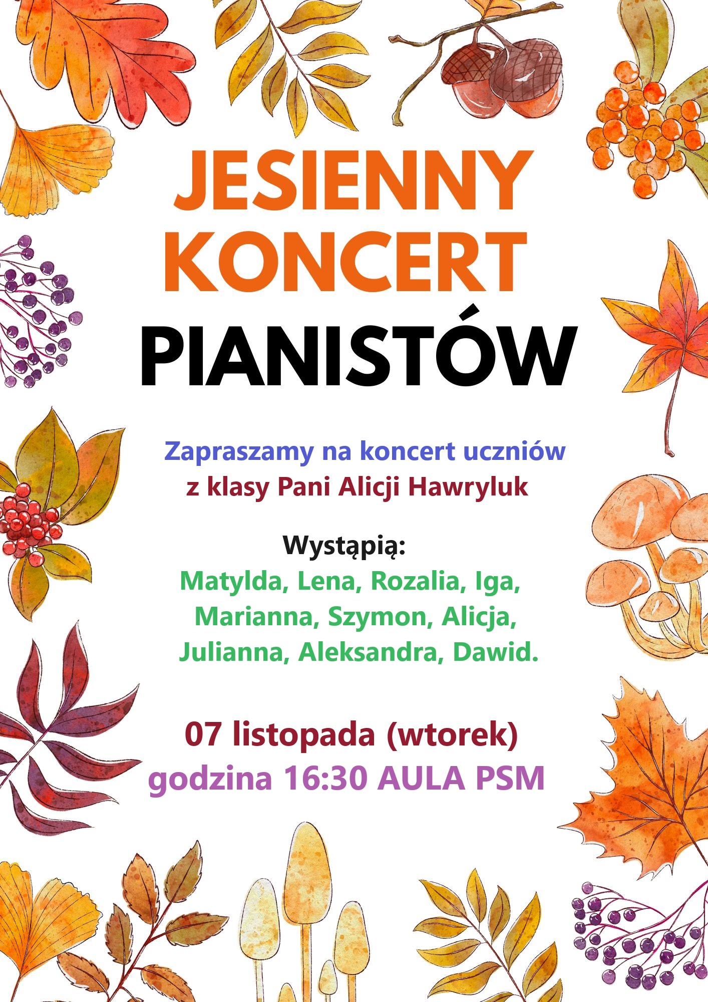 Serdecznie zapraszamy na "Jesienny koncert pianistów", na którym wystąpią uczniowie p. Alicji Hawryluk: Matylda, Lena, Rozali, Iga, Marianna, Szymon, Alicja, Julianna, Aleksandra, Dawid. Koncert odbędzie się w sali koncertowej naszej szkoły 07 listopada 2023 r. o godzinie 16:30.