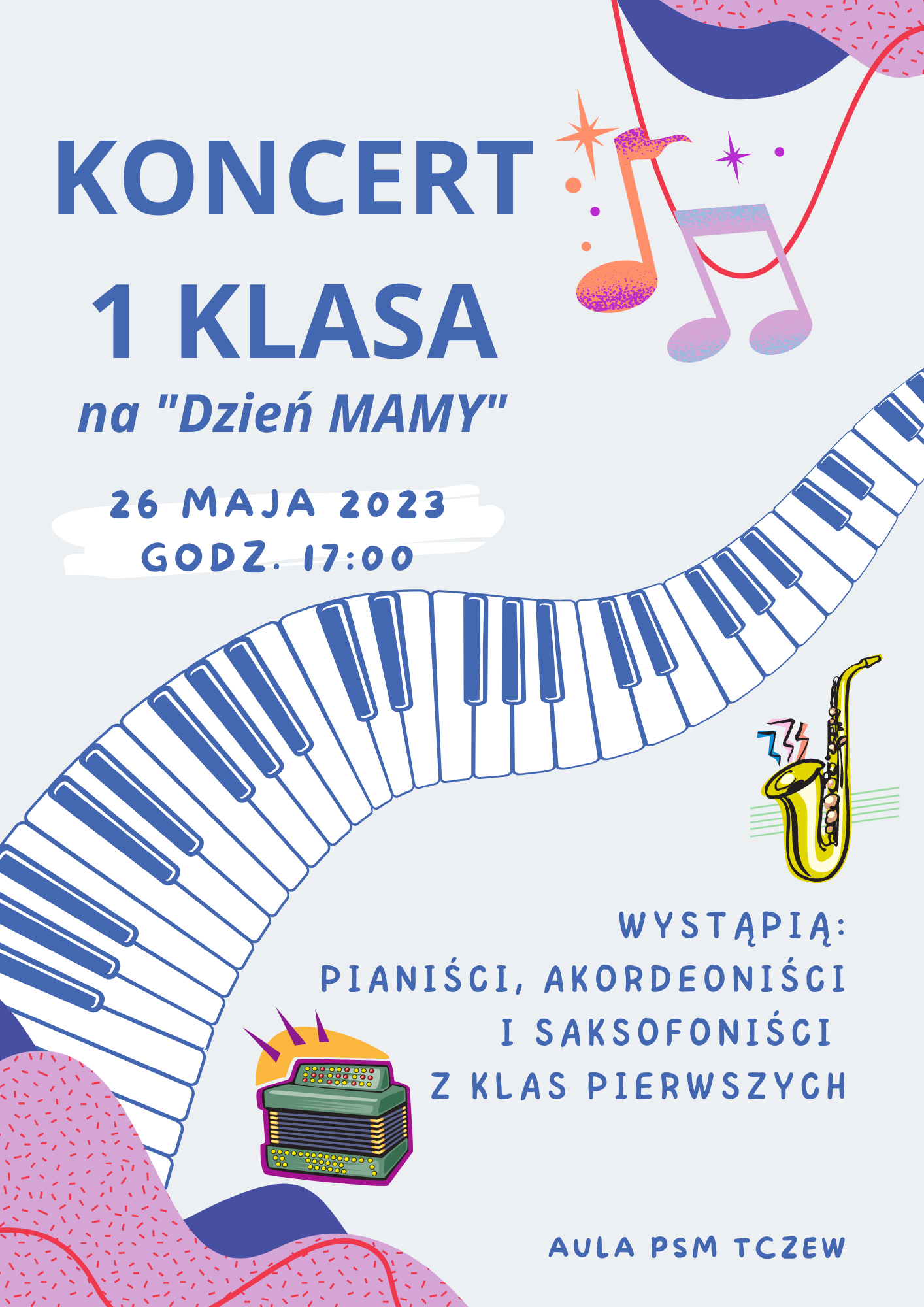 26 maja 2023 (piątek) na godzinę 17:00 zapraszamy na KONCERT 1 KLASA w wykonaniu: pianistów, akordeonistów i saksofonistów z klas pierwszych. Sala koncertowa PSM w Tczewie. Wstęp wolny.