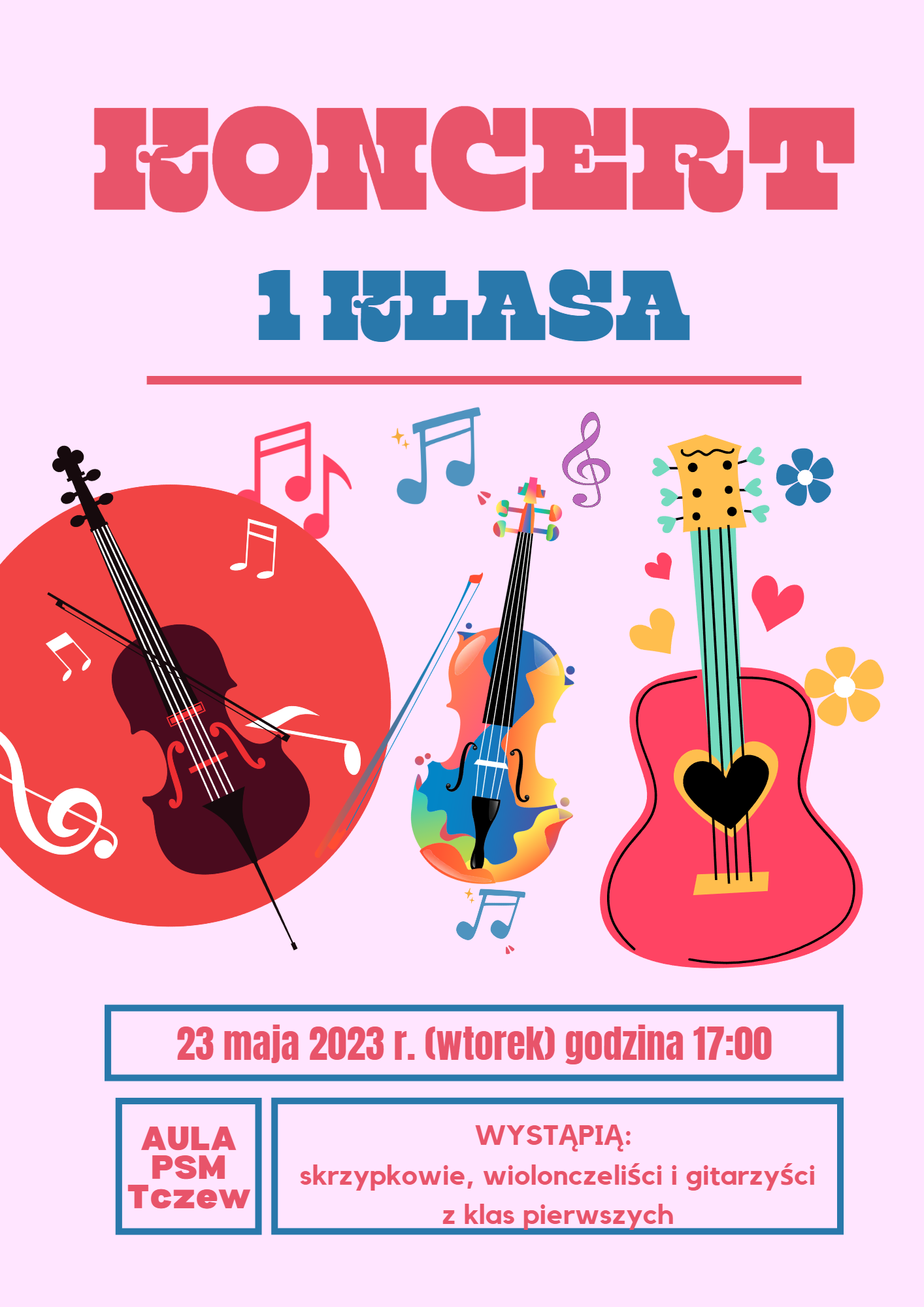 Serdecznie zapraszamy 23 maja 2023 r. na godzinę 17:00 do Auli PSM w Tczewie, gdzie odbędzie się "KONCERT 1 KLASA", na którym wystąpią skrzypkowie, wiolonczeliści i gitarzyści z klas pierwszych.