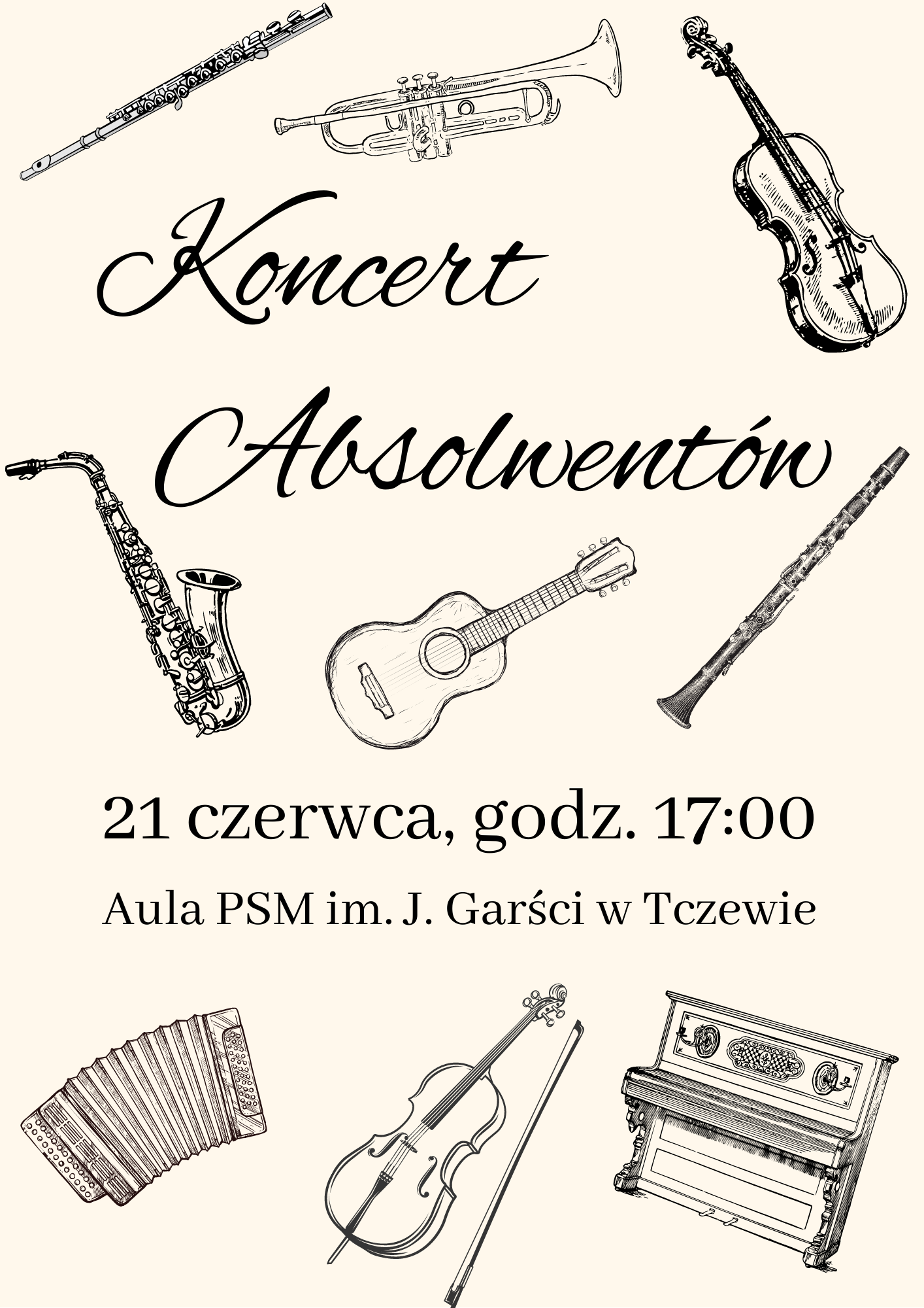 21 czerwca 2023 (środa) na godzinę 17:00 zapraszamy do sali koncertowej w naszej szkole, gdzie odbędzie się "Koncert absolwentów" - tegoroczni absolwenci zagrają w naszych murach swój ostatni koncert jako uczniowie Państwowej Szkoły Muzycznej I stopnia w Tczewie. ZAPRASZAMY!