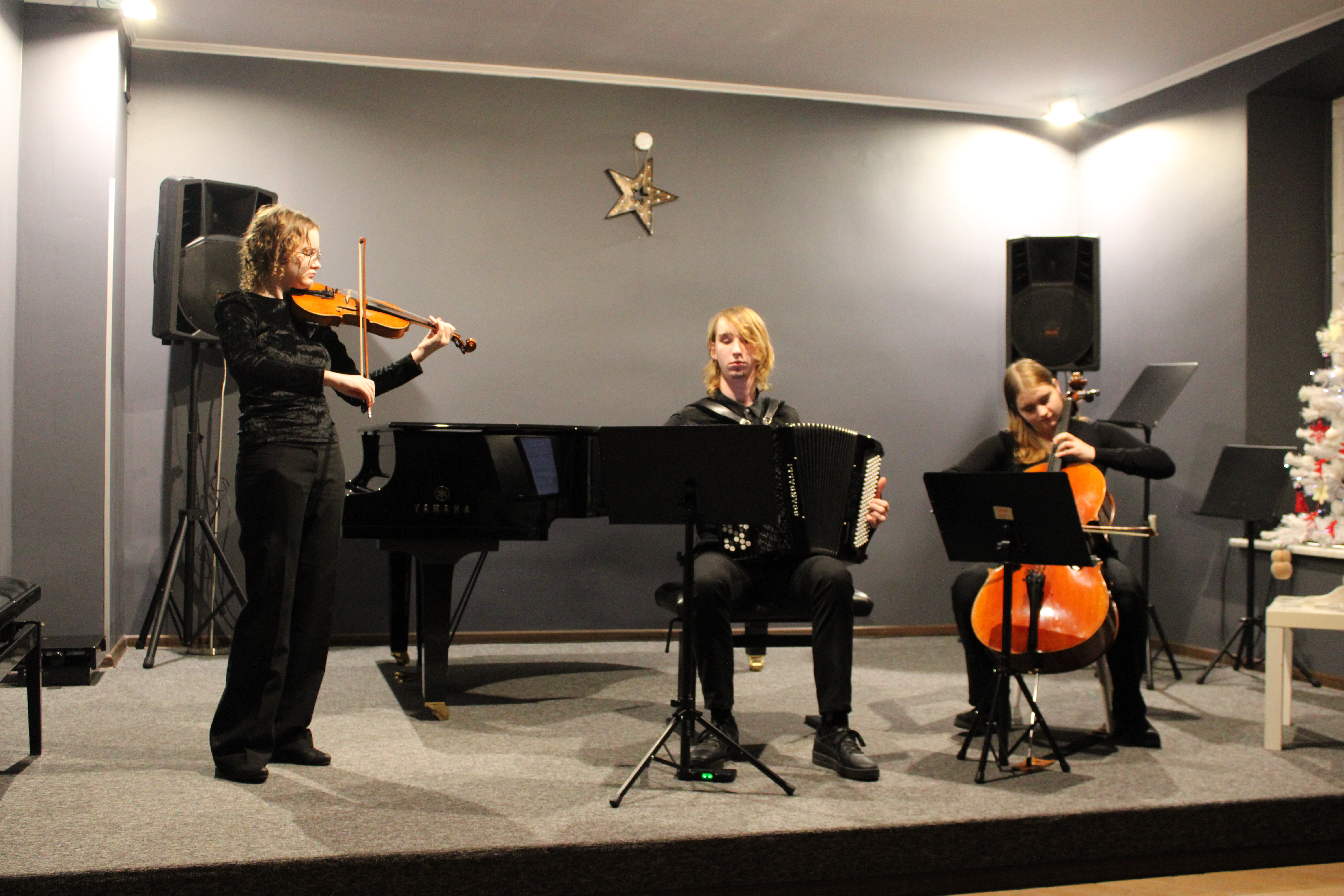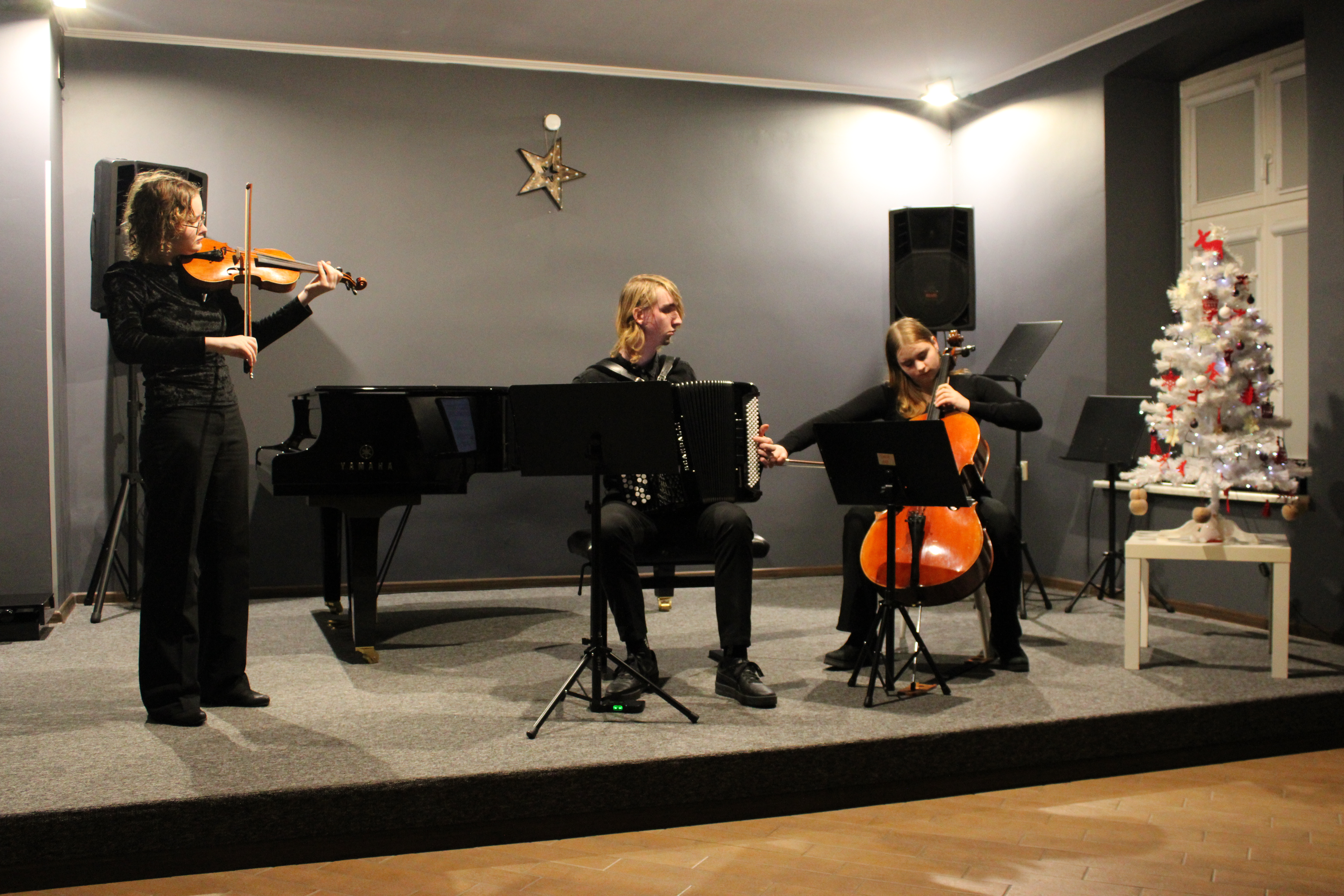 Jako support wystąpili nasi uczniowie z Filii w Pelplinie - rodzeństwo Kuchannych (Michalina - skrzypce, Andrzej - akordeon, Karolina - wiolonczela), którzy przygotowują się do konkursu. Misia, Andrzej, Karola - mocno trzymamy kciuki za wasze dalsze sukcesy, graliście pięknie!