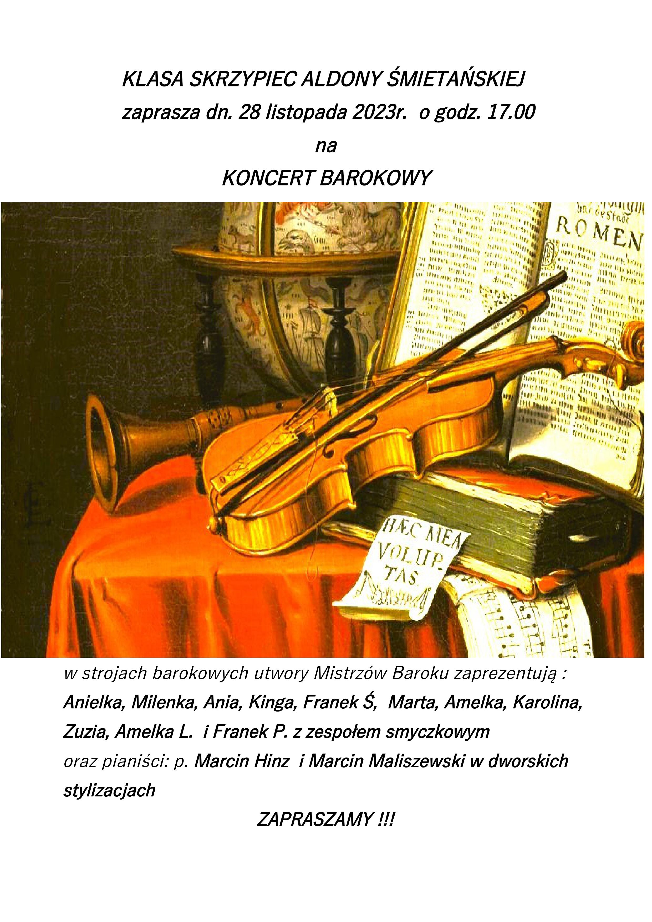 Dnia 28 listopada 2023 r. na godzinę 17:00 skrzypkowie z klasy p. Aldony Śmietańskiej zapraszają na KONCERT BAROKOWY. Wykonawcy (Anielka, Milenka, Ani, Kinga, Franek Ś., Marta, Amelka, Karolina, Zuzia, Amelka L. i Franek P.) wystąpią w barokowych stylizacjach. Towarzyszyć im będą przy fortepianie p. Marcin Hinz i p. Marcin Maliszewski. Zapraszamy!