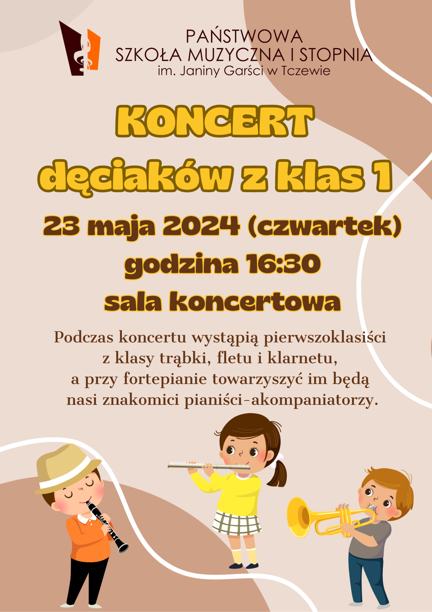 23 maja 2024 (czwartek), na godzinę 16:30 do sali koncertowej szkoły muzycznej zapraszamy na "KONCERT dęciaków z klas 1". Podczas koncertu zagrają pierwszoklasiści z klasy trąbki, fletu, klarnetu, a przy fortepianie towarzyszyć im będą nasi znakomici pianiści-akompaniatorzy.