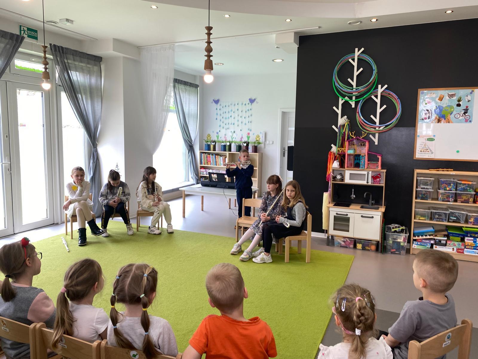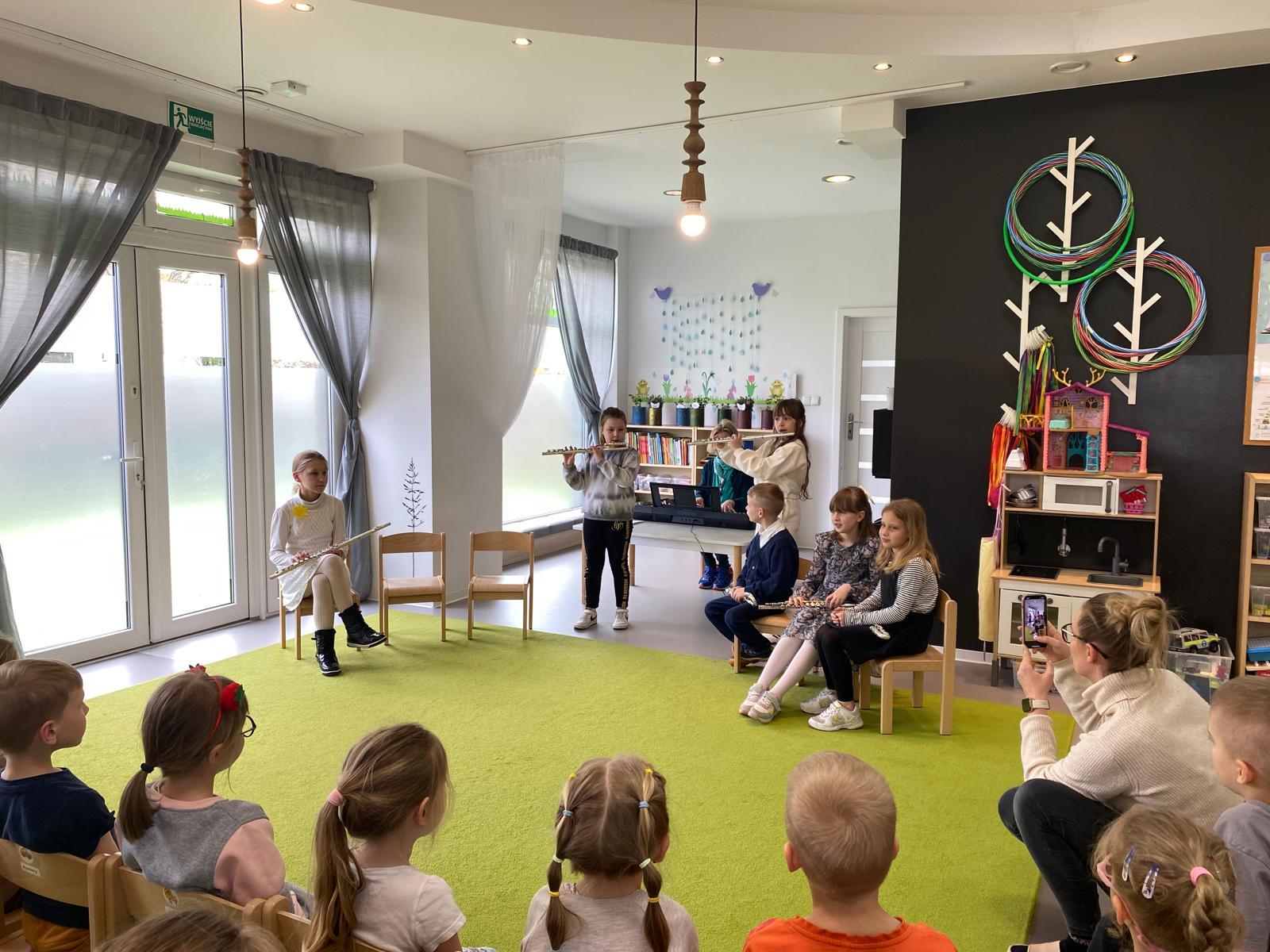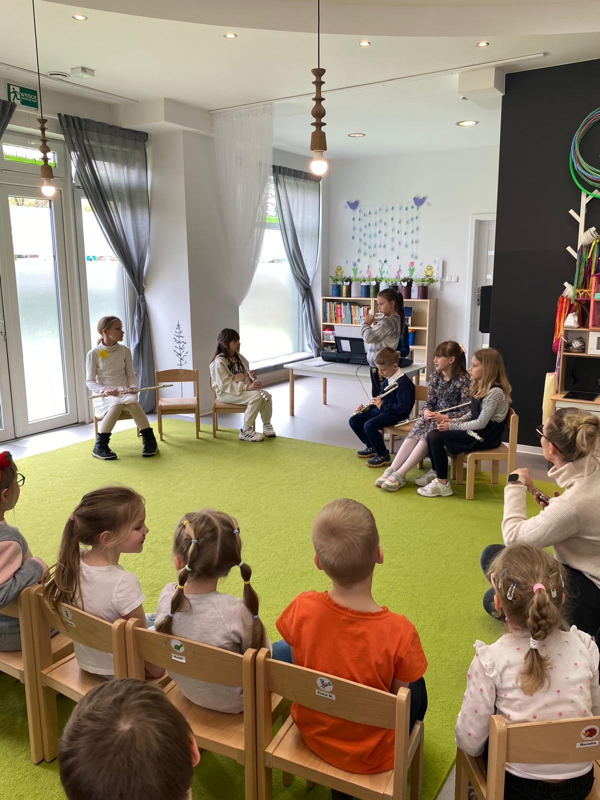Nasi uczniowie dużo koncertują i to nie tylko w murach szkoły. Tym razem, w miniony piątek (19.04.2024) grupa flecistek i flecista wraz ze swoją nauczycielką - p. Moniką Tamulewicz - odwiedzili Niepubliczne Przedszkole "Na Górkach". Uczniowie znakomicie zaprezentowali możliwości i różnorodność brzmienia fletu. Przedszkolaki były zachwycone i w ramach podziękowania za koncert, obdarowały muzyków laurkami.