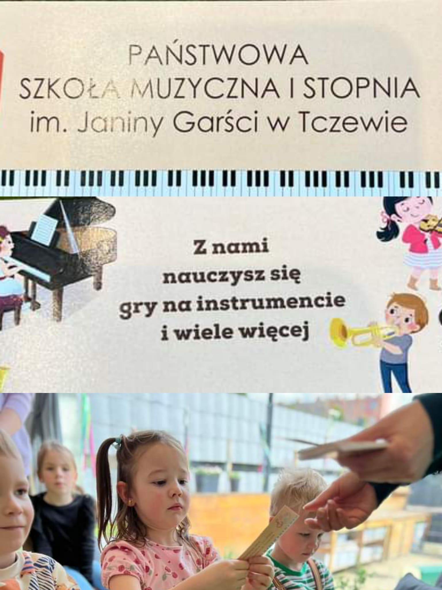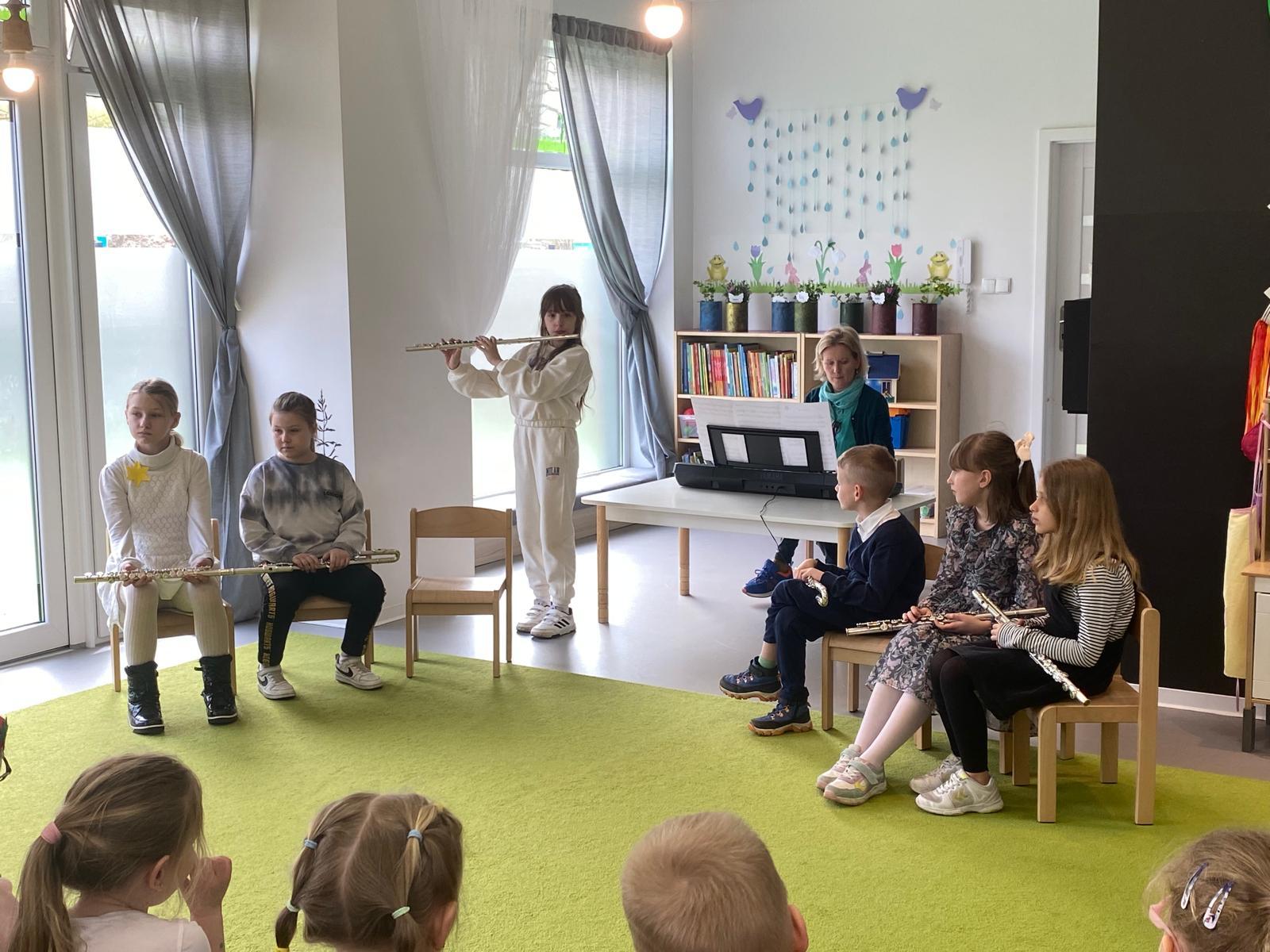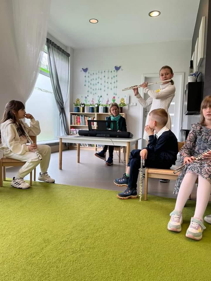 Nasi uczniowie dużo koncertują i to nie tylko w murach szkoły. Tym razem, w miniony piątek (19.04.2024) grupa flecistek i flecista wraz ze swoją nauczycielką - p. Moniką Tamulewicz - odwiedzili Niepubliczne Przedszkole "Na Górkach". Uczniowie znakomicie zaprezentowali możliwości i różnorodność brzmienia fletu. Przedszkolaki były zachwycone i w ramach podziękowania za koncert, obdarowały muzyków laurkami.