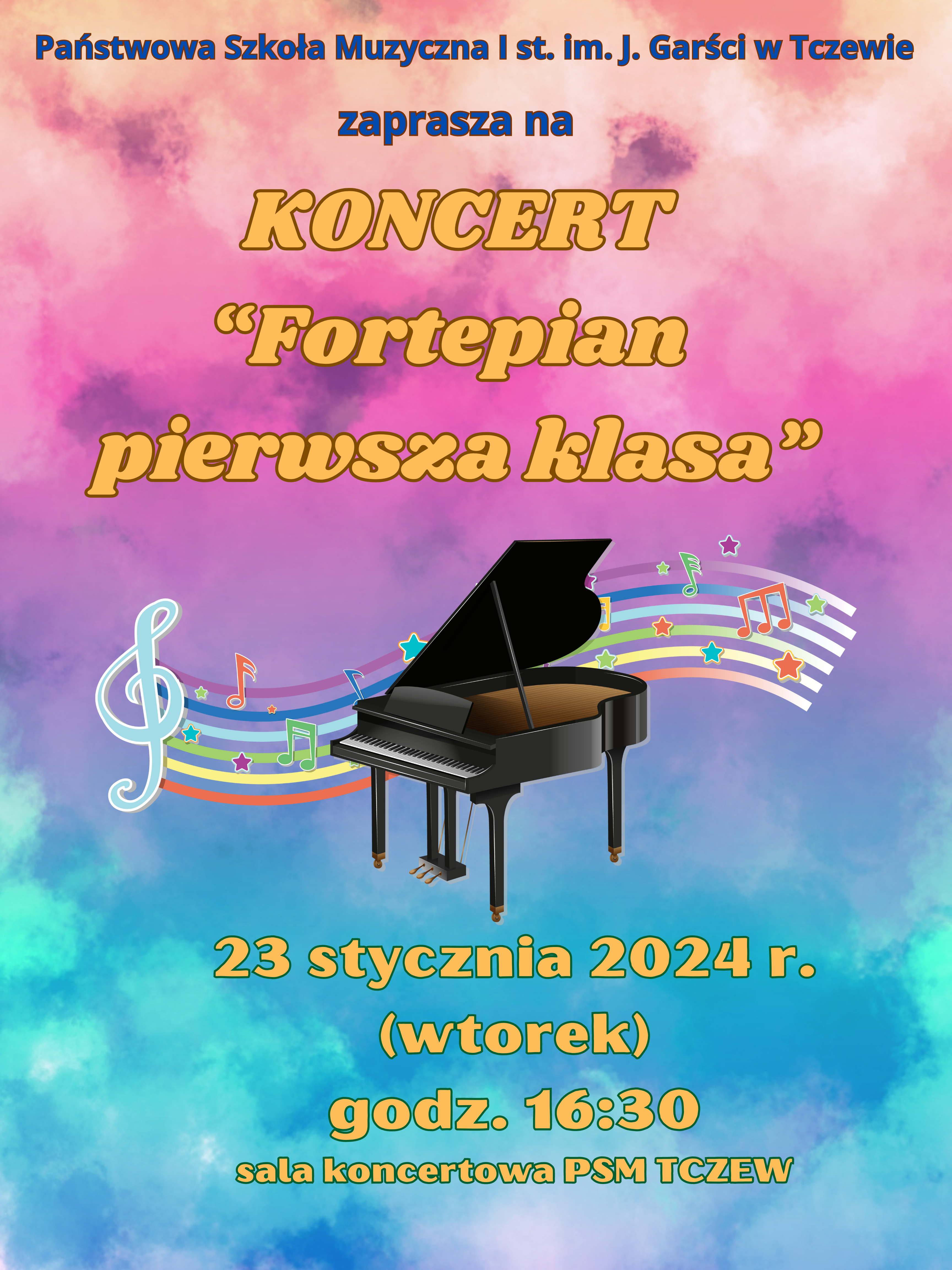 Zapraszamy na Koncert "Fortepian pierwsza klasa", podczas którego będziemy mieli okazję wysłuchać prezentacji naszych najmłodszych pianistów z klas pierwszych. Koncert odbędzie się 23 stycznia 2024 r. (wtorek) o godzinie 16:30 w sali koncertowej szkoły muzycznej. ZAPRASZAMY!