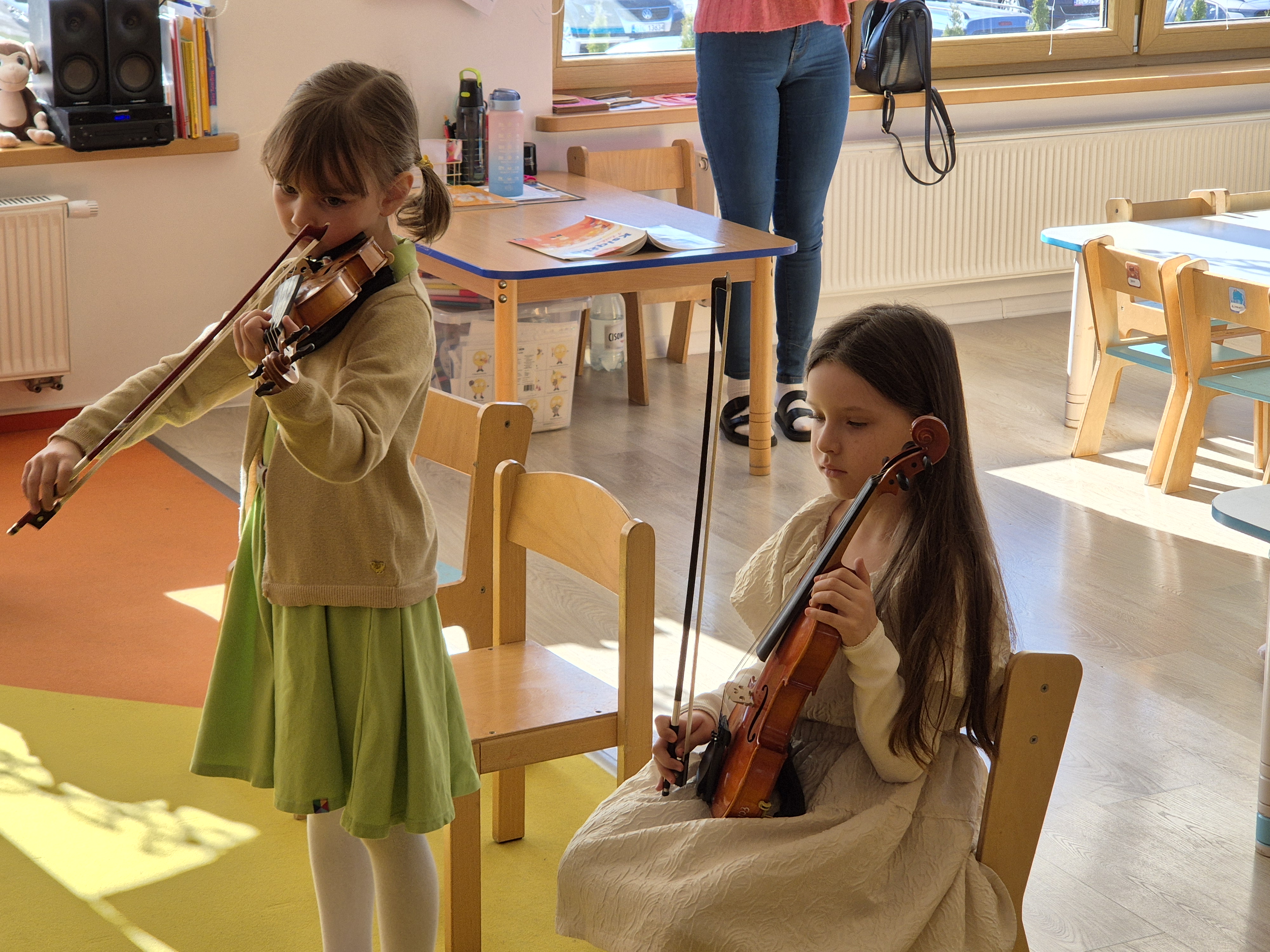 02 kwietnia 2025 r. dwie skrzypaczki z klasy 1 - Aleksandra Frass i Pola Koziura - zagrały miniKoncert w Przedszkolu Niebieskie Migdały. Koncertu wysłuchały grupy "Fistaszki" - do której aktualnie należy Ola oraz grupa "Orzeszki". W grupie młodszej po koncercie, przedszkolaki mogli zobaczyć na czym polega praca w szkole muzycznej, a opowiedziały o tym p. Karolina Borris - pracująca w sekretariacie szkoły oraz p. Marta Kołodziejska-Kacprzak - nauczycielka skrzypiec.