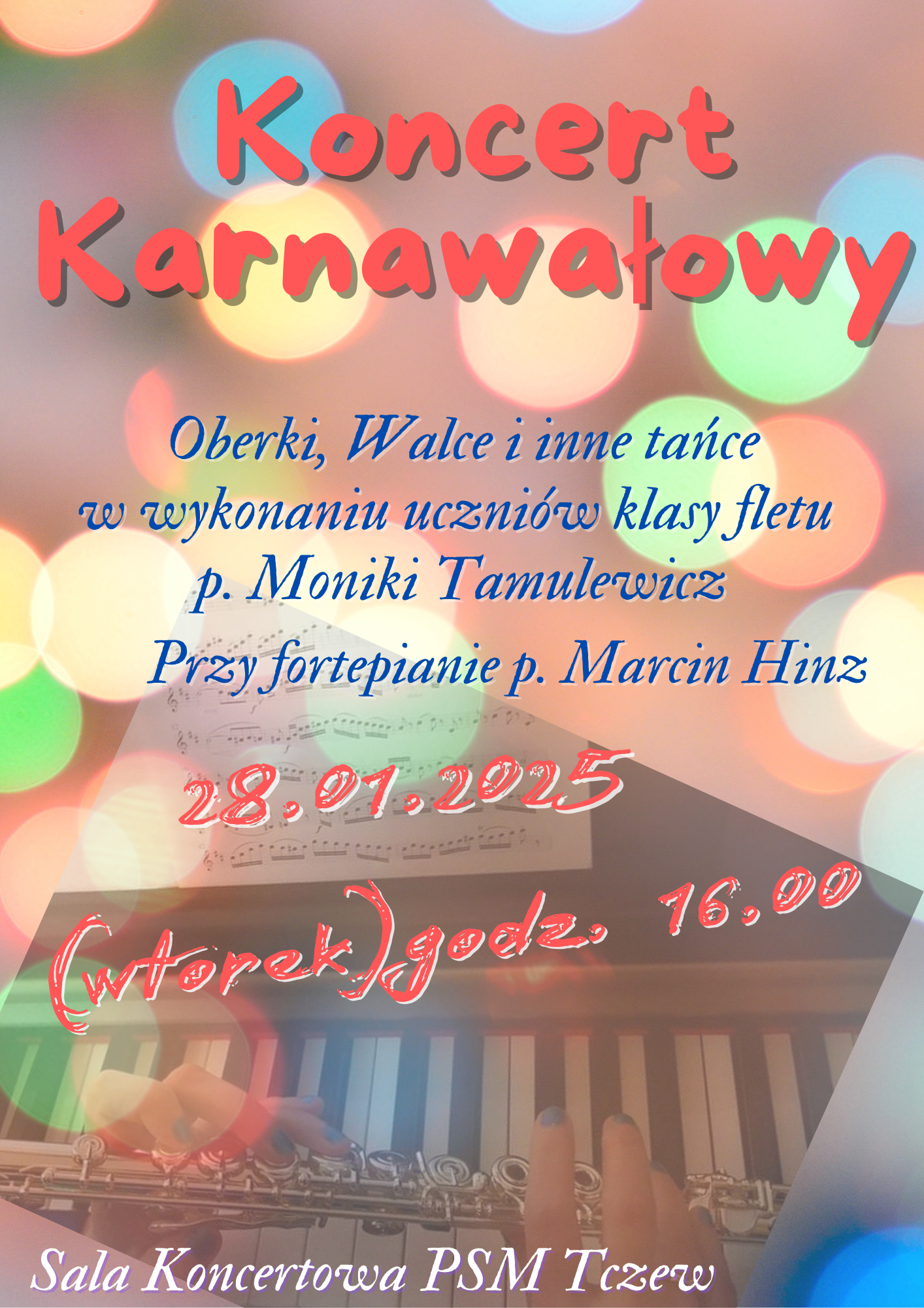 28 stycznia br. na godzinę 16:00 zapraszamy na Koncert karnawałowy klasy fletu p. Moniki Tamulewicz. W wykonaniu flecistów usłyszymy Oberki, Walce i inne tańce, a przy fortepianie uczniom towarzyszyć będzie p. Marcin Hinz. Zapraszamy.