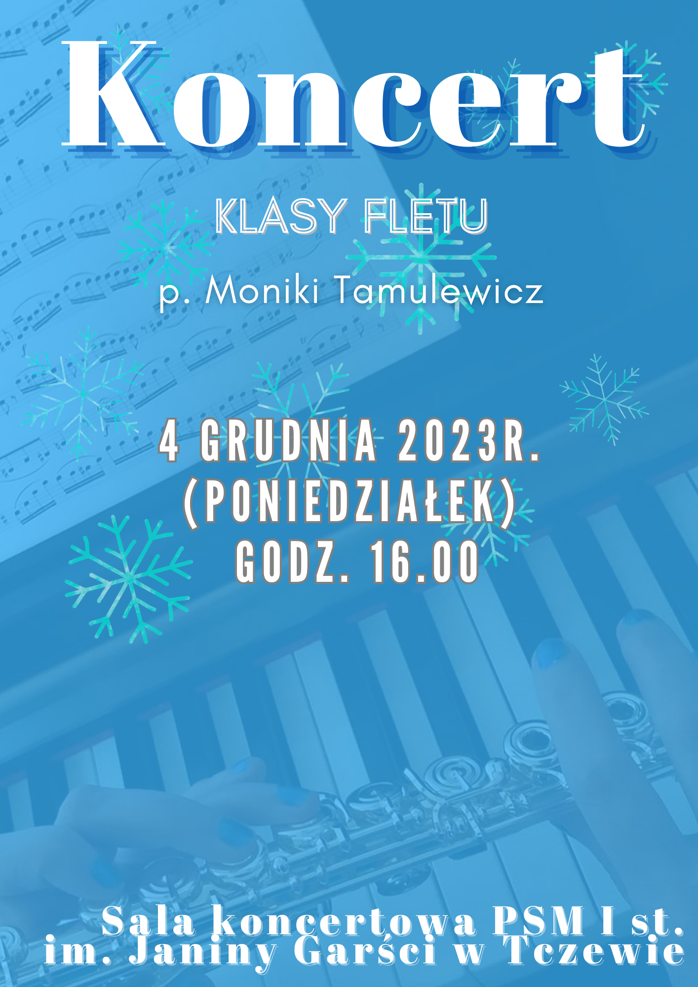 Serdecznie zapraszamy na koncert flecistów - uczniów p. Moniki Tamulewicz, który odbędzie się 04 grudnia 2023 r. (poniedziałek) o godzinie 16:00 w sali koncertowej PSM Tczew.