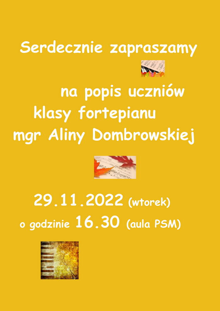 Zapraszamy na Koncert klasy fortepianu p. Aliny Dombrowskiej, który odbędzie się 9 grudnia 2022 r. o godzinie 16:30 w Auli PSM w Tczewie.