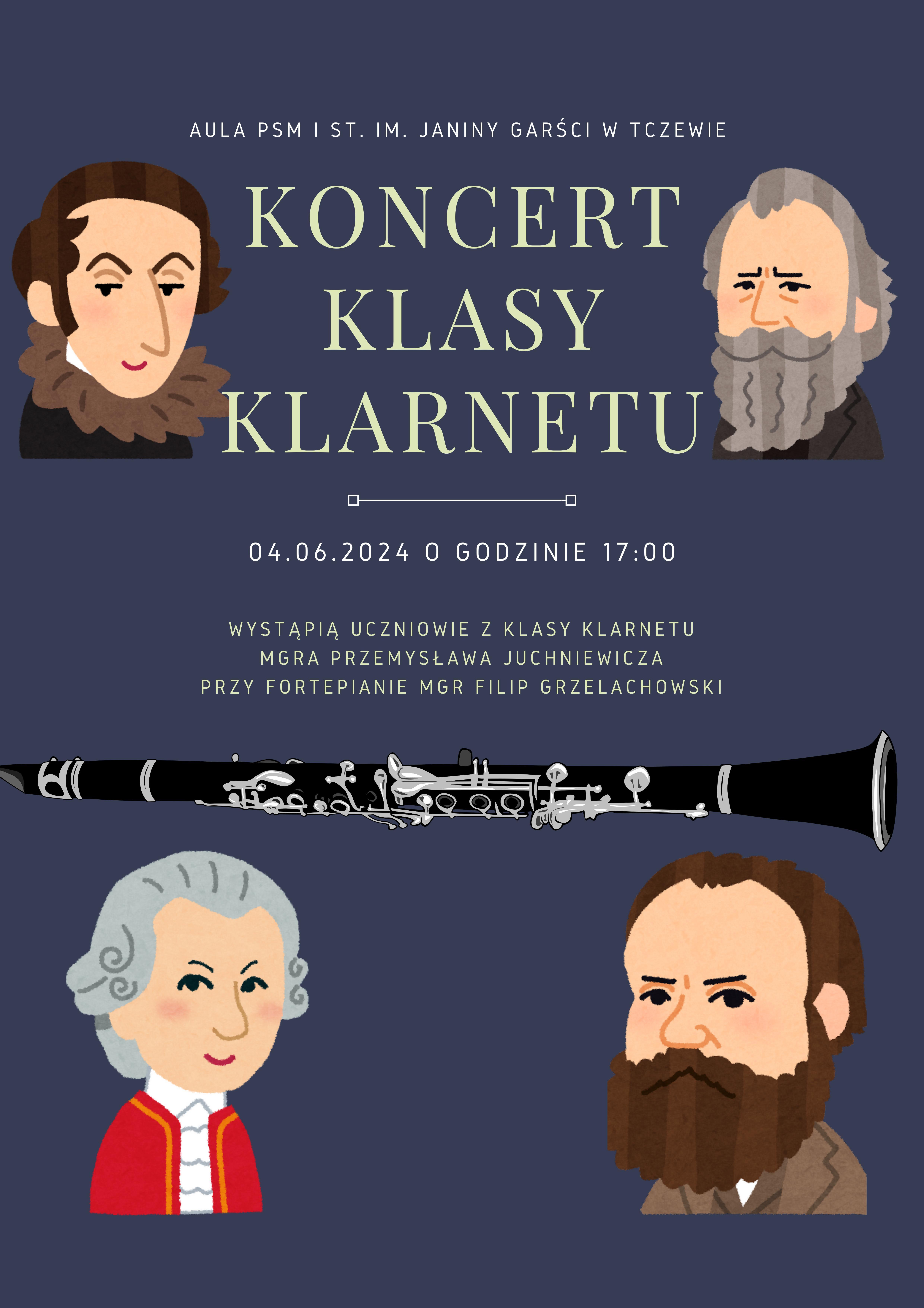 Zapraszamy na Koncert klasy klarnetu mgra Przemysława Juchniewicza, który odbędzie się 04 czerwca 2024 o godzinie 17:00 w sali koncertowej szkoły muzycznej. Przy fortepianie klarnecistom będzie towarzyszył mgr Filip Grzelachowski. ZAPRASZAMY!
