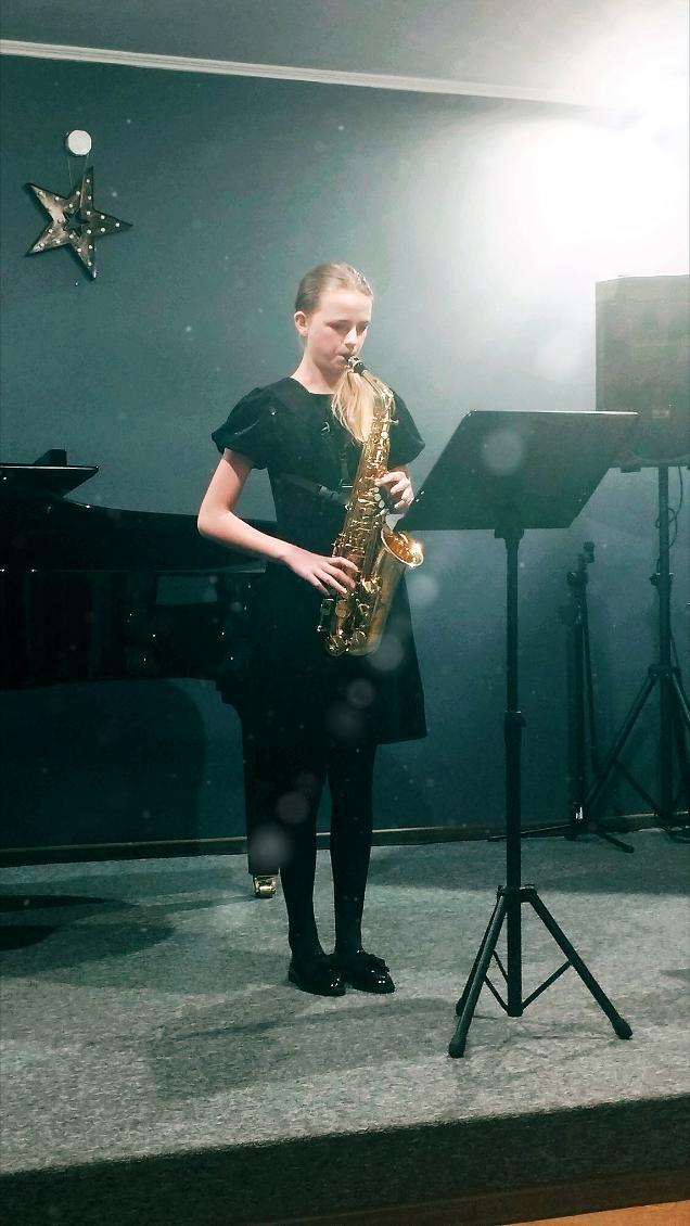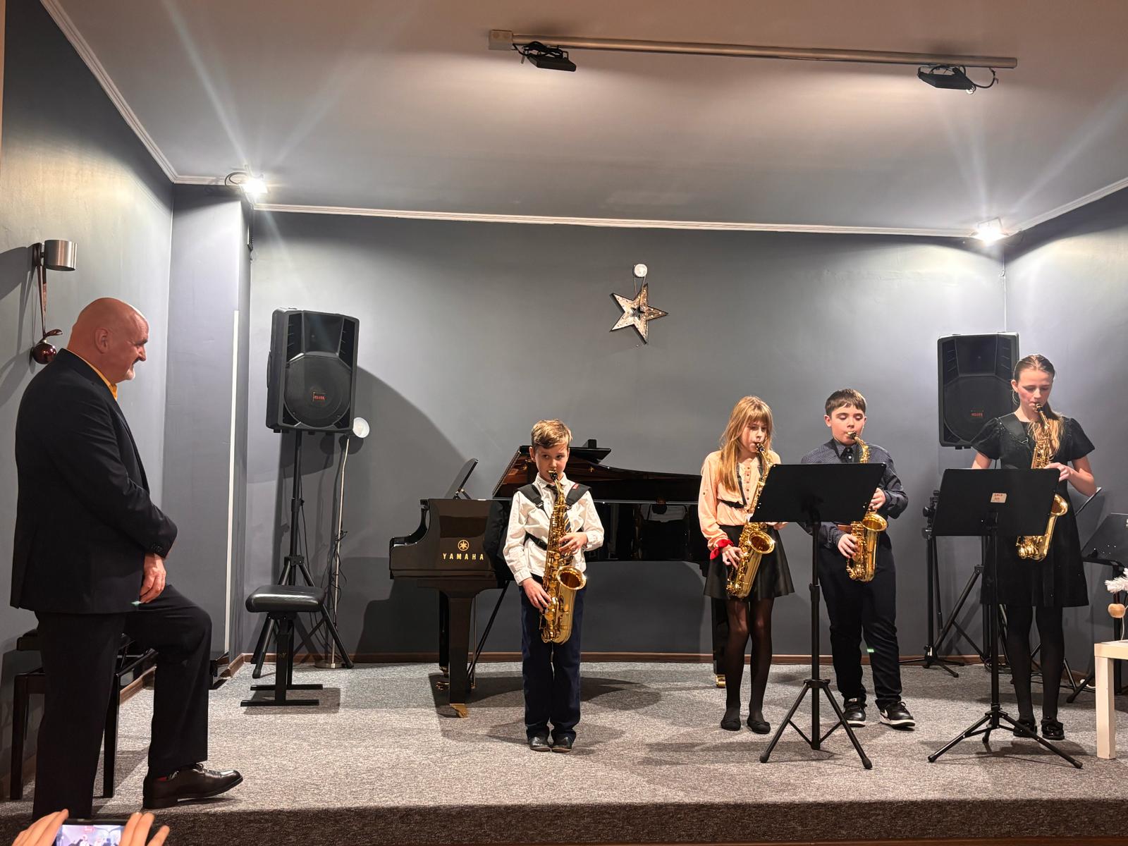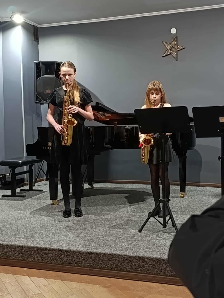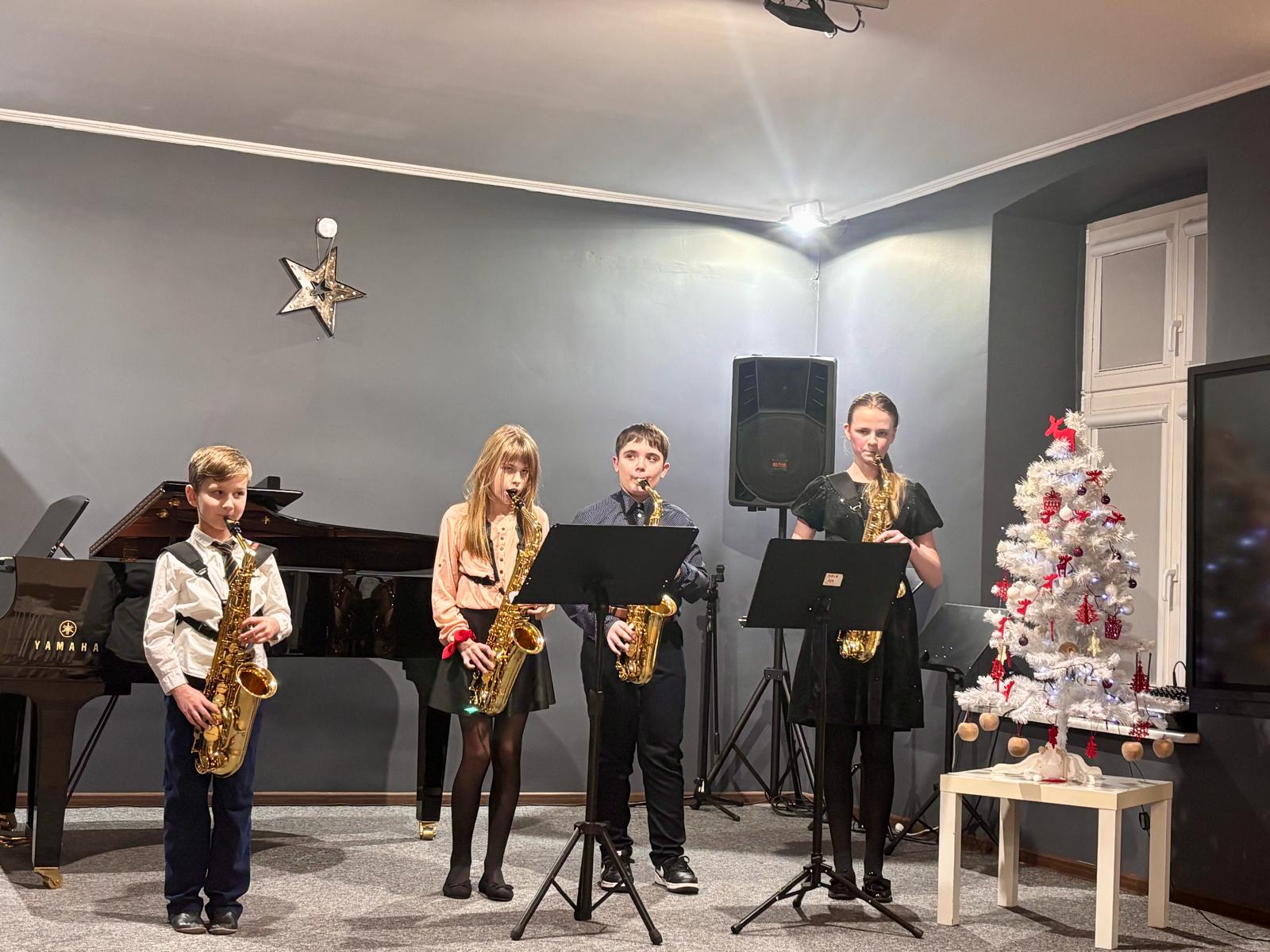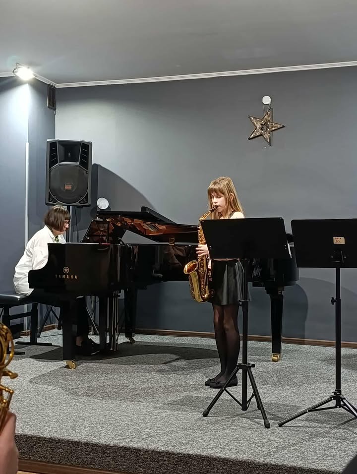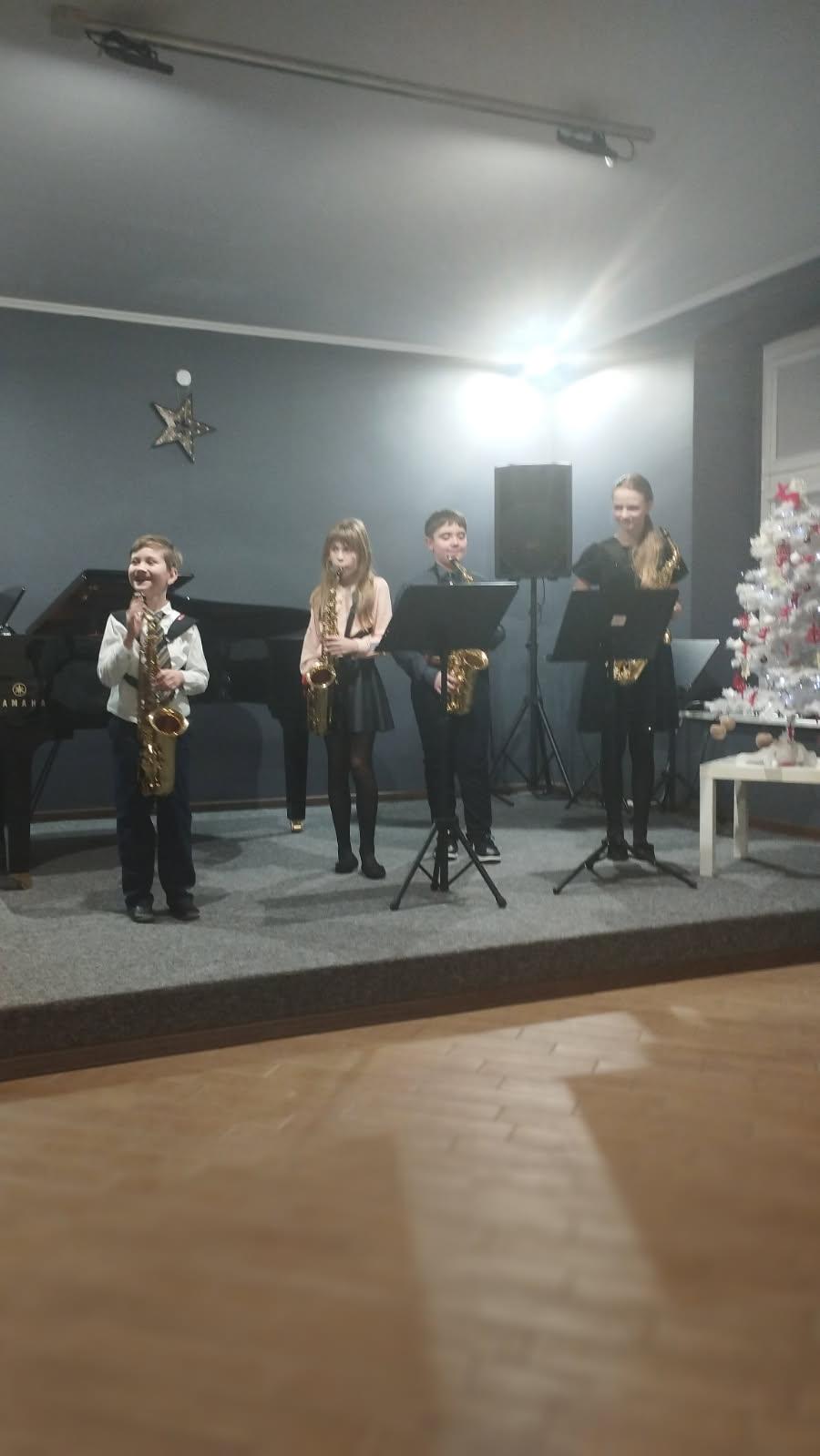 10 grudnia 2025 r. o godzinie 16:30 w szkole muzycznej odbył się Koncert klasy saksofonu Adama Wendta. Poza występami solowymi usłyszeliśmy kwartet saksofonowy w repertuarze kolędowym. Przy fortepianie uczniom towarzyszyła p. Monika Madej-Strukiel.